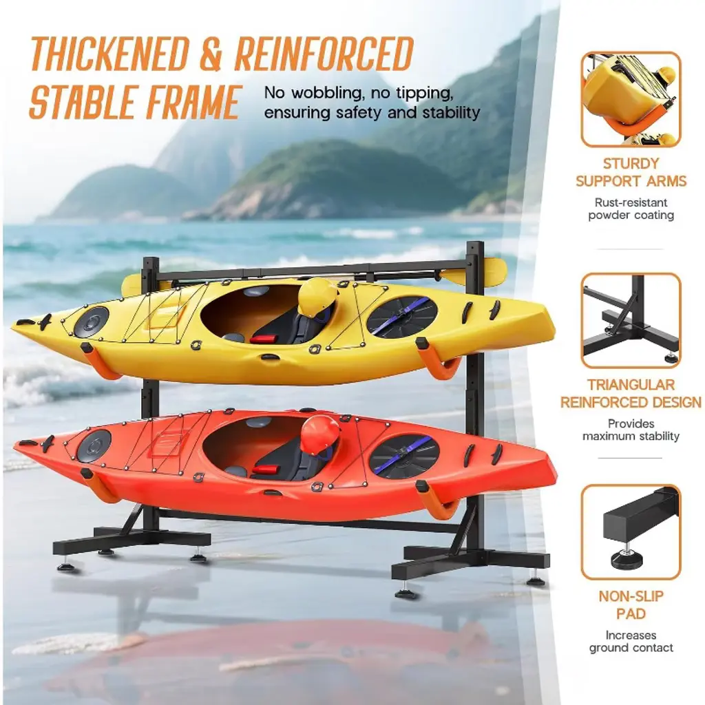 This heavy-duty kayak rack is designed for durability and stability, featuring a unique T-shaped base and non-slip rubber pads to prevent shifting or tipping. The rust-resistant steel frame ensures long-lasting performance, even in harsh weather conditions like saltwater, sun, and rain. The rack’s curved arms, equipped with EVA sleeves, offer superior protection, preventing scratches and damage to your kayaks during storage. With adjustable width and height, this versatile rack is easy to set up anywhere without the need for tools or drilling, accommodating various kayak sizes. Built to hold up to four kayaks or other water sports gear, this freestanding rack supports up to 280 lbs, ensuring reliable storage without bending or breaking. Assembly is quick and simple, allowing you to start storing your kayaks in minutes.