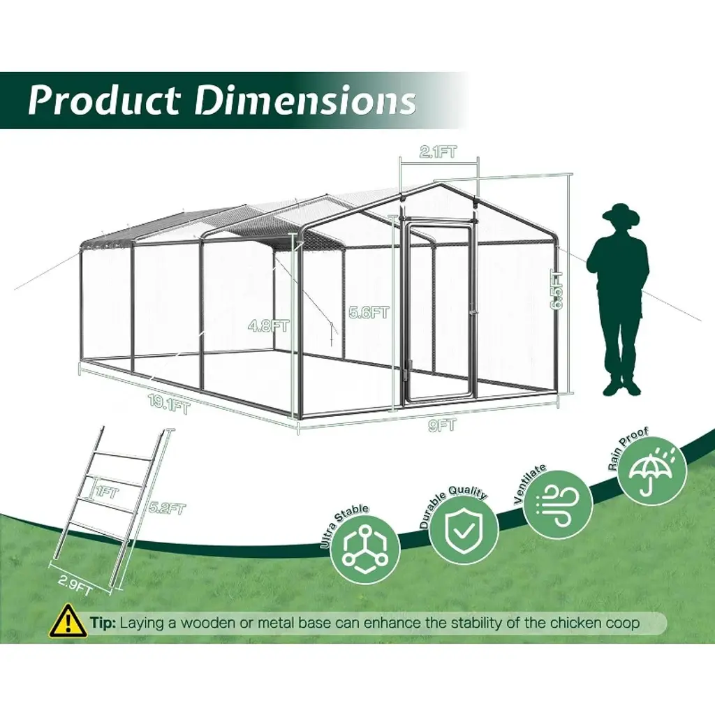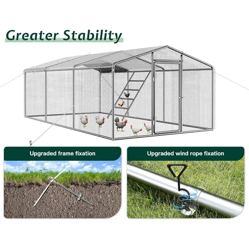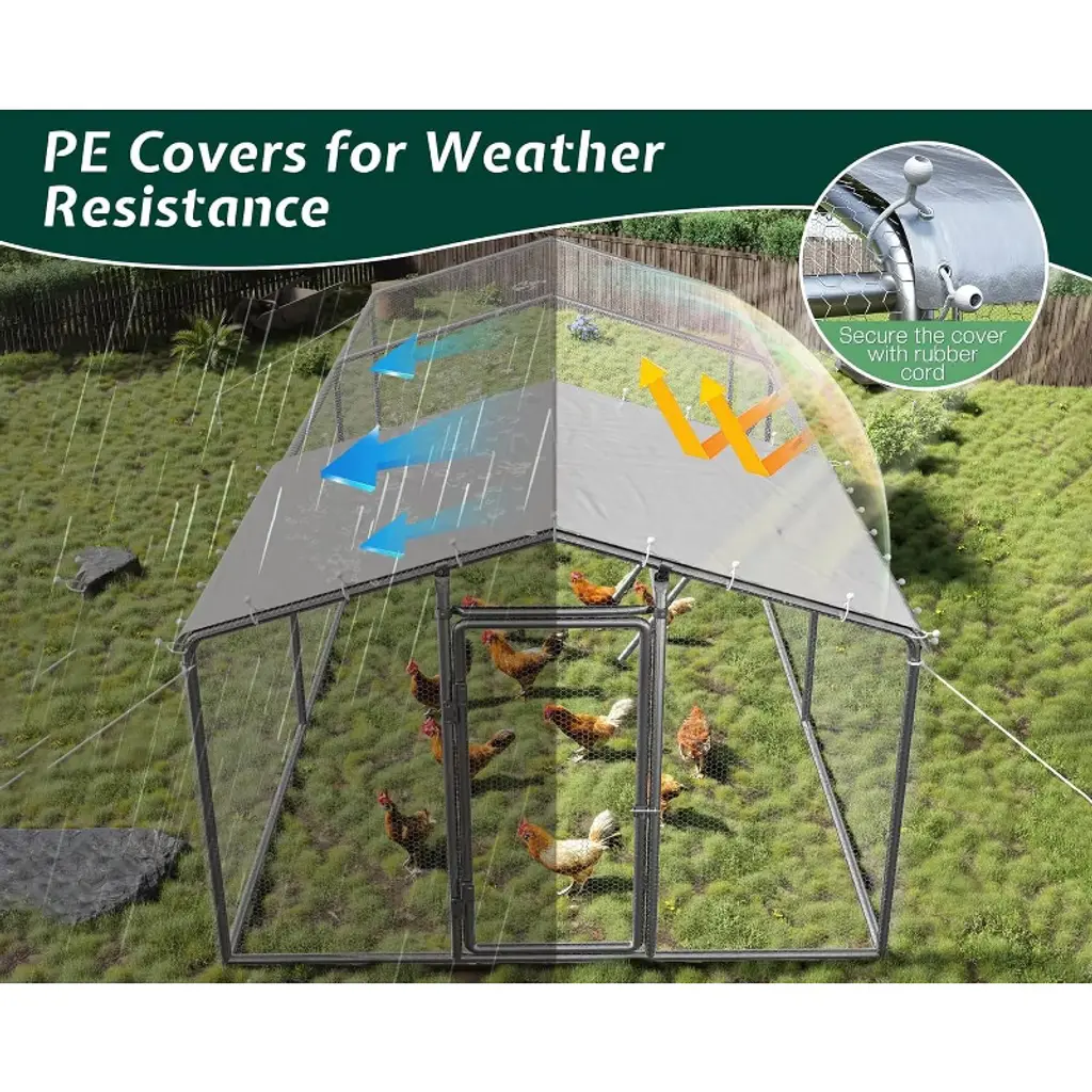 This extra-large chicken coop provides a spacious walk-in area for 40–80 chickens, complete with a built-in galvanized perch that supports natural roosting behaviors. The sturdy, all-weather PE roof shields your poultry from the sun and rain, while the durable hexagonal wire mesh keeps predators out while allowing for proper airflow, ensuring a safe and healthy environment. Built with a heavy-duty galvanized steel frame, reinforced with spiral ground stakes, anchors, and zip ties, this chicken house is designed for lasting stability. The easy-access hinged door with a rounded frame ensures smooth entry and exit. Suitable for chickens, ducks, rabbits, and more, it offers a versatile space for your poultry to roam, rest, and play. Assembly is quick and straightforward with two people and can be further stabilized with a wooden or concrete base for long-term use.