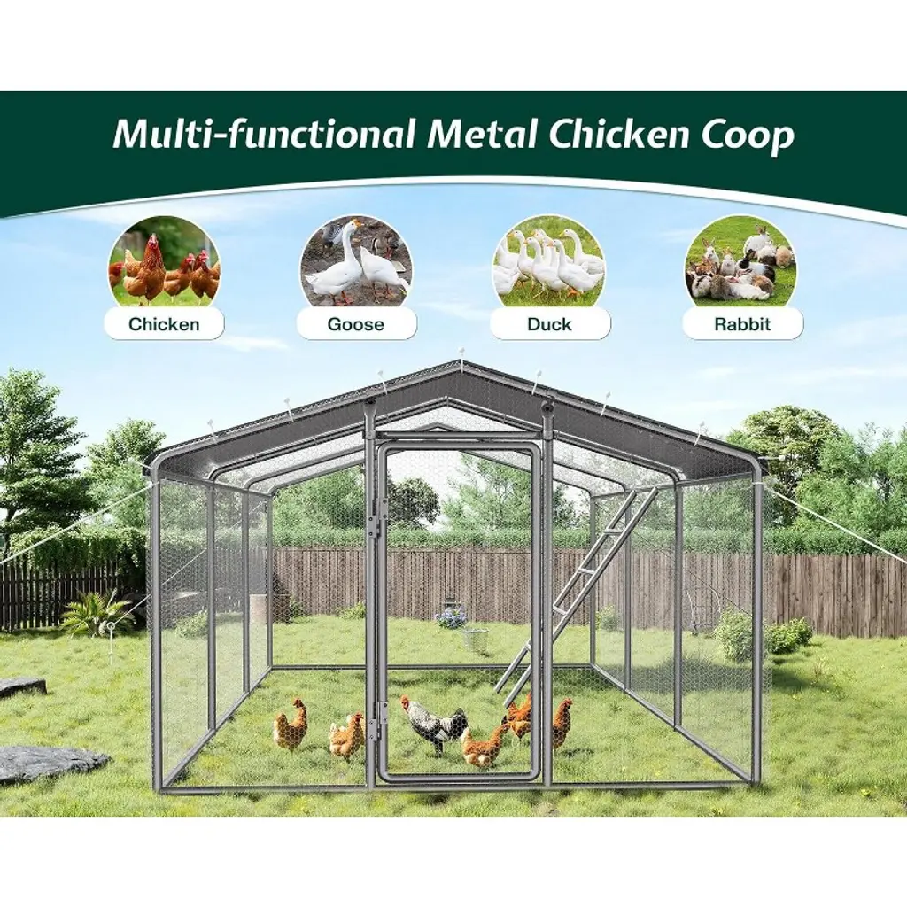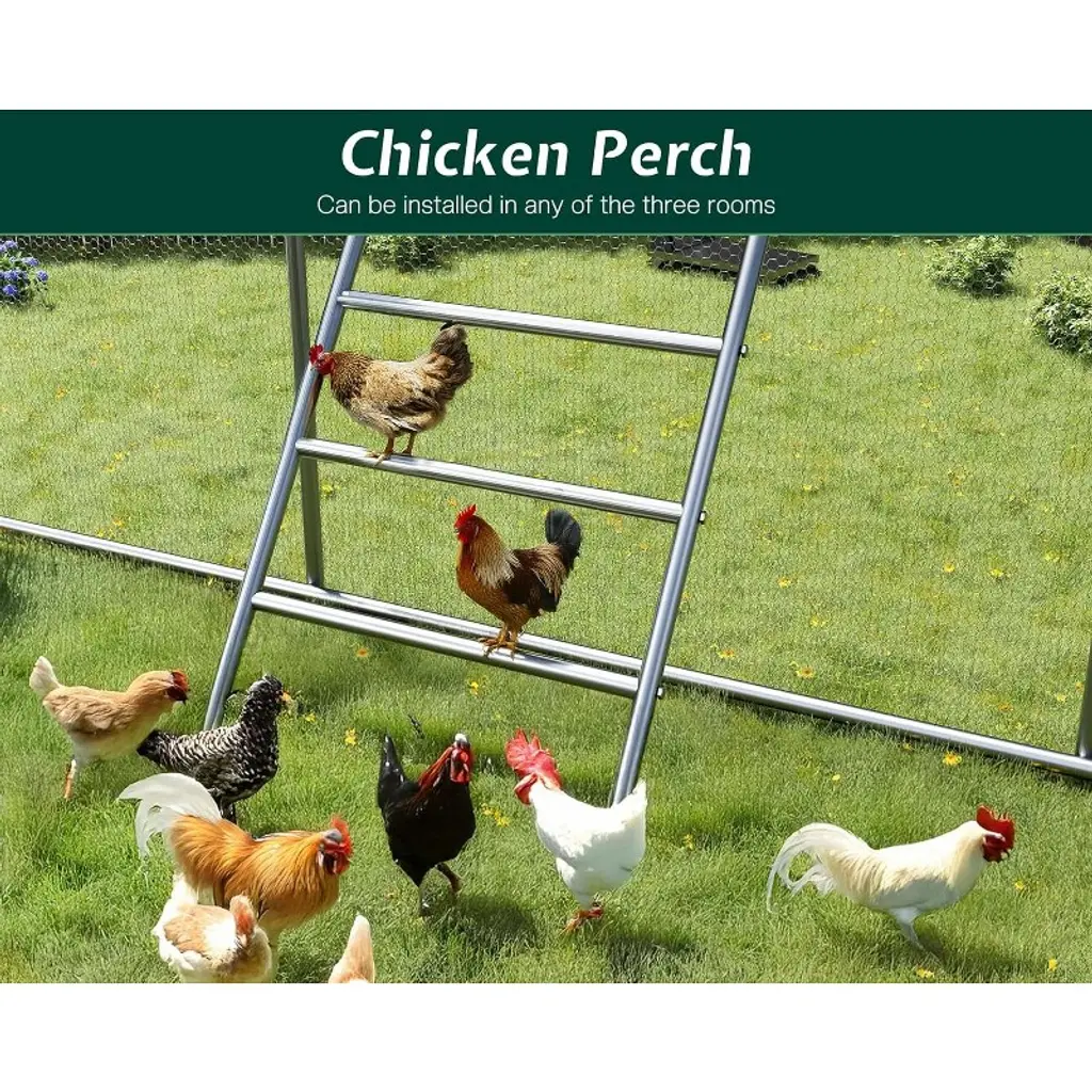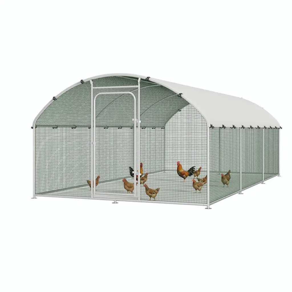 This extra-large chicken coop provides a spacious walk-in area for 40–80 chickens, complete with a built-in galvanized perch that supports natural roosting behaviors. The sturdy, all-weather PE roof shields your poultry from the sun and rain, while the durable hexagonal wire mesh keeps predators out while allowing for proper airflow, ensuring a safe and healthy environment. Built with a heavy-duty galvanized steel frame, reinforced with spiral ground stakes, anchors, and zip ties, this chicken house is designed for lasting stability. The easy-access hinged door with a rounded frame ensures smooth entry and exit. Suitable for chickens, ducks, rabbits, and more, it offers a versatile space for your poultry to roam, rest, and play. Assembly is quick and straightforward with two people and can be further stabilized with a wooden or concrete base for long-term use.