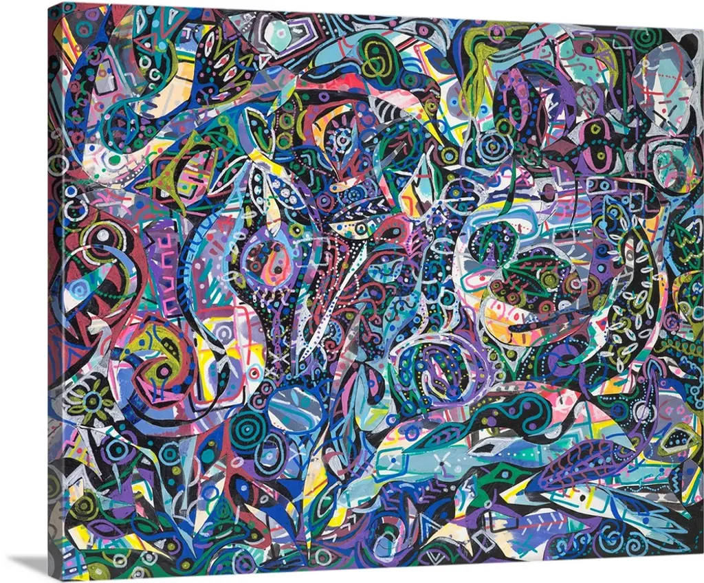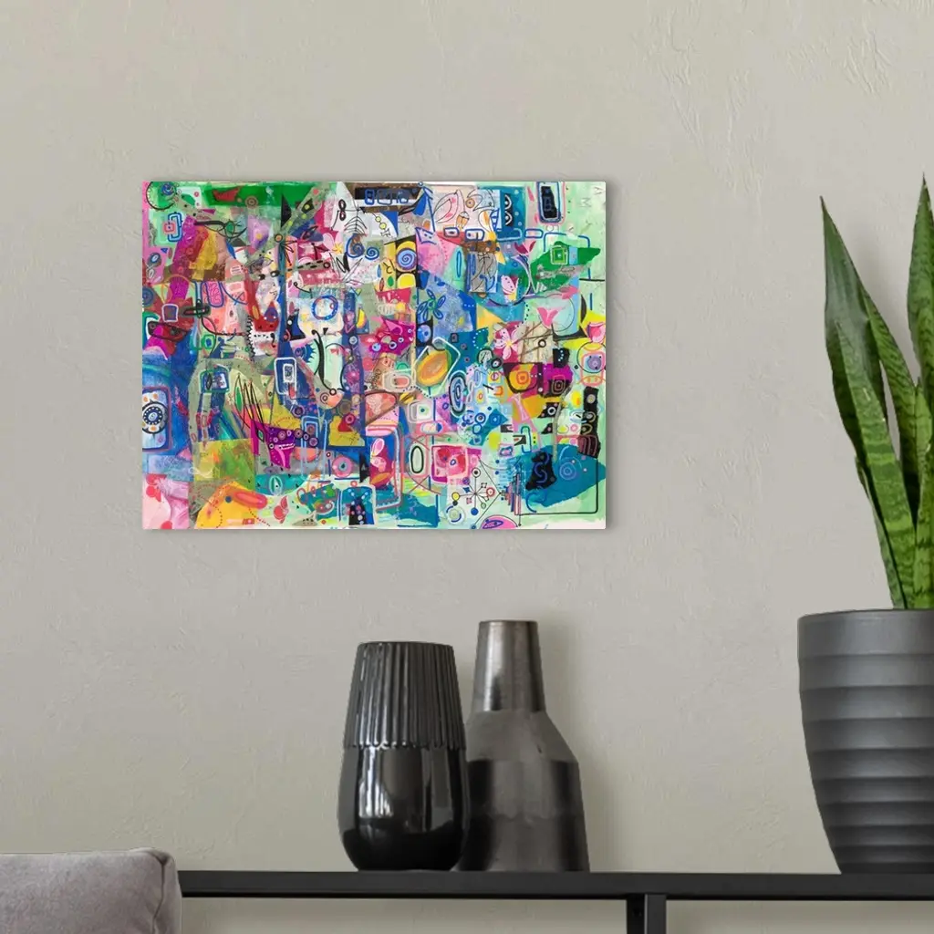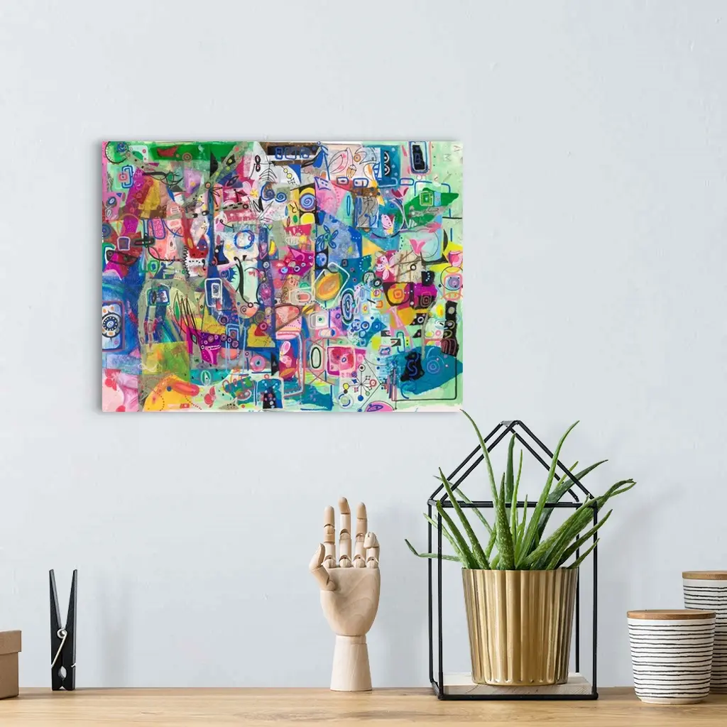A light, vibrant, contemporary piece of art in a grafitti style in bright pastel colors with elements of mid century design