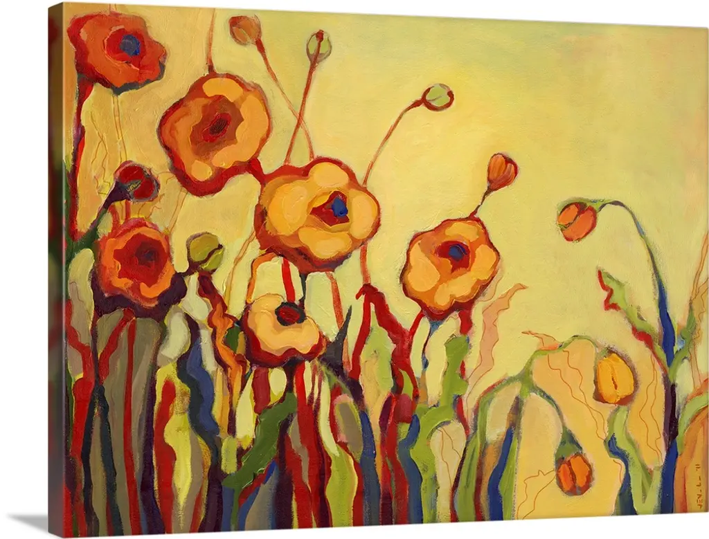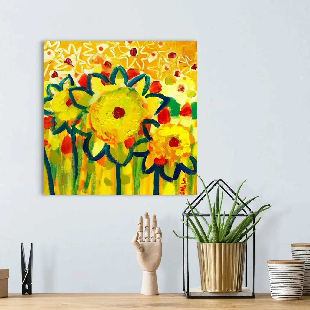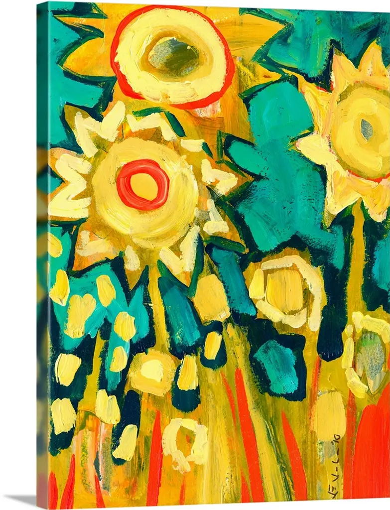 Huge contemporary art depicts an extensive group of minimally detailed flowers. Artist uses an abundance of circles and short brush strokes throughout this canvas art.