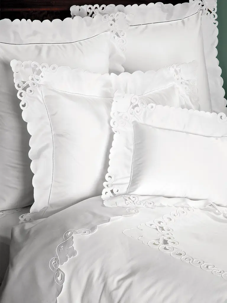Like one-of-a-kind trousseau linens from your great grandmother's day, this exquisite import will be treasured for its lovingly hand-embroidered cut-work scrolls and scalloped edges. Utterly romantic in White on White 100% cotton sateen from Italy, 600 thread count, nicely detailed with hand hemstitching. Enjoy tomorrow's memories today.