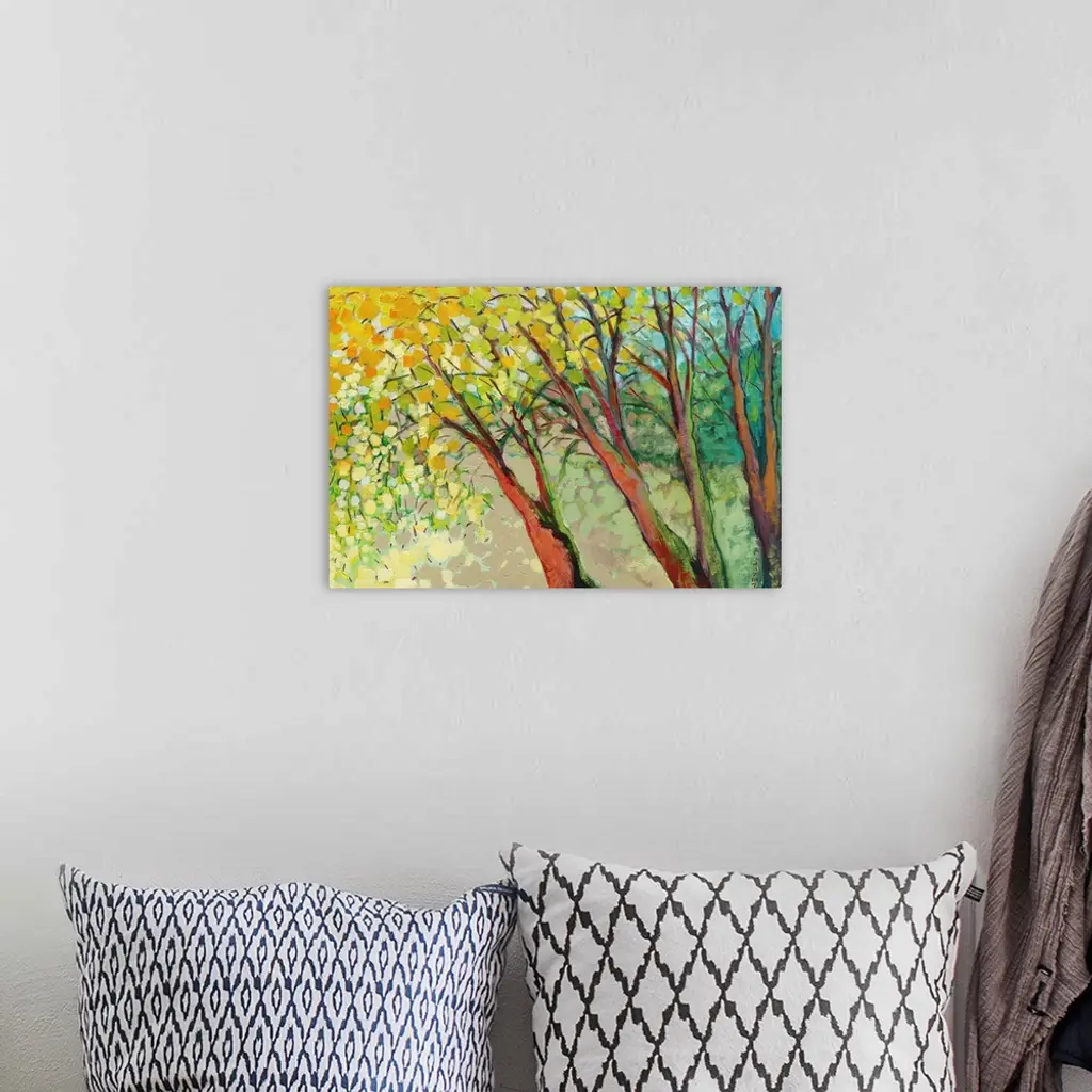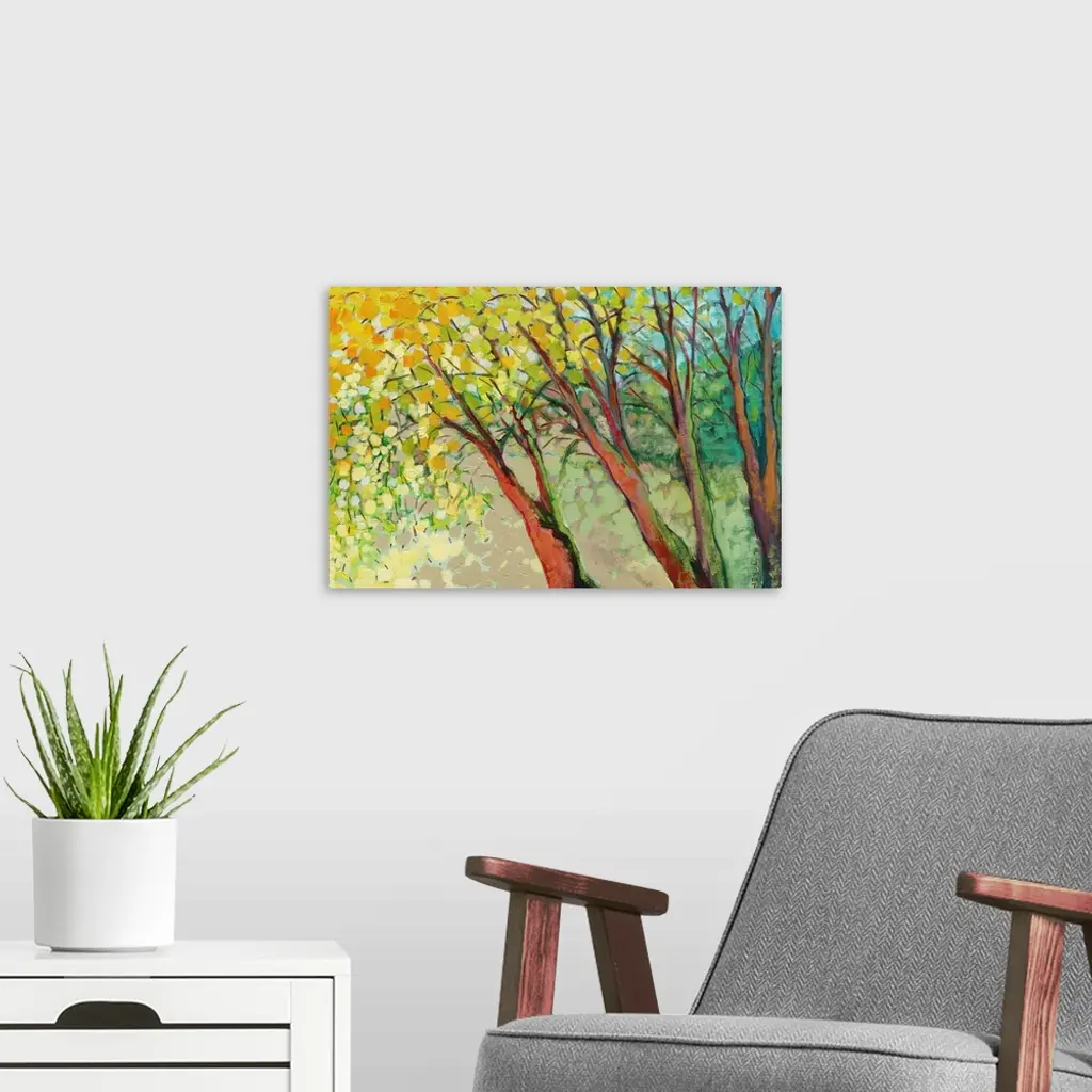 A contemporary impressionistic landscape of three painterly trees and abstract leaves made large brush strokes.