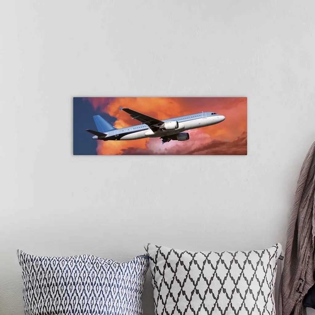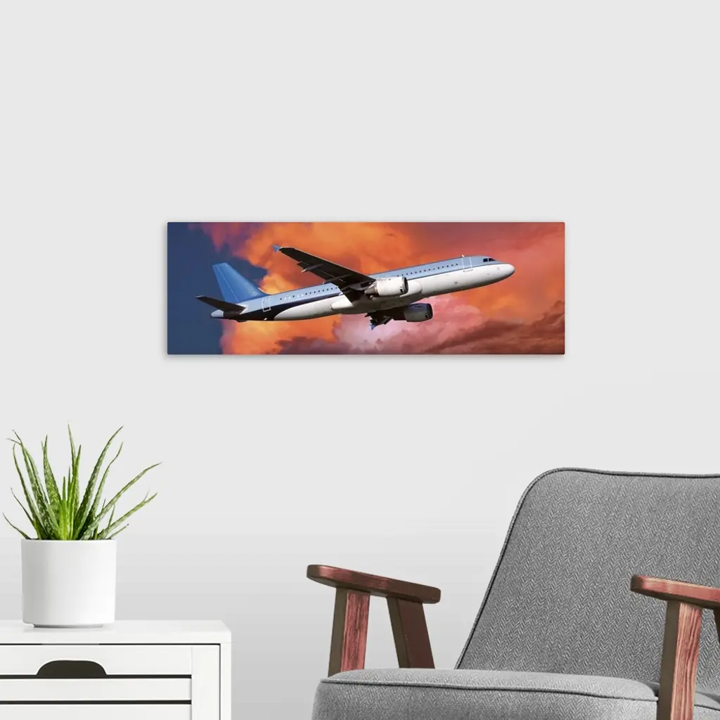 This large panoramic picture is of a commercial airplane ascending into warm toned clouds.