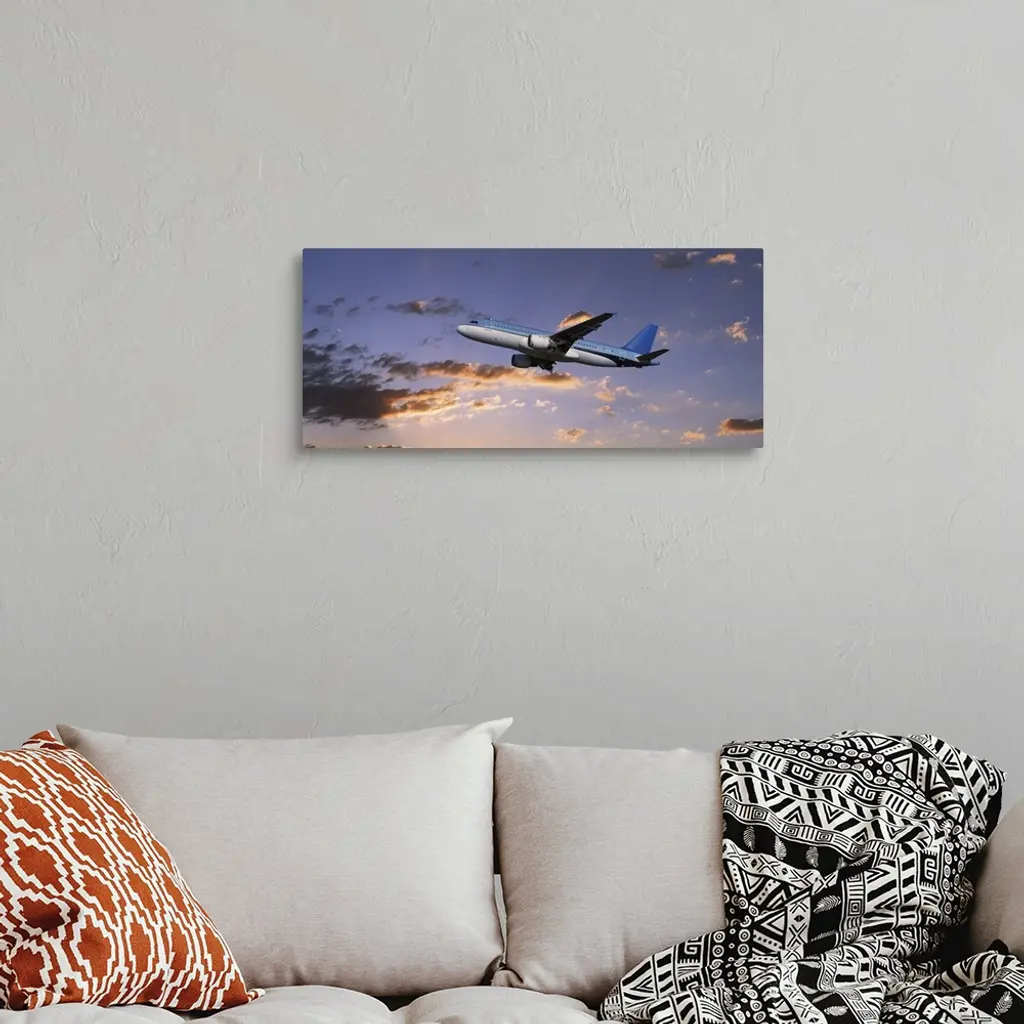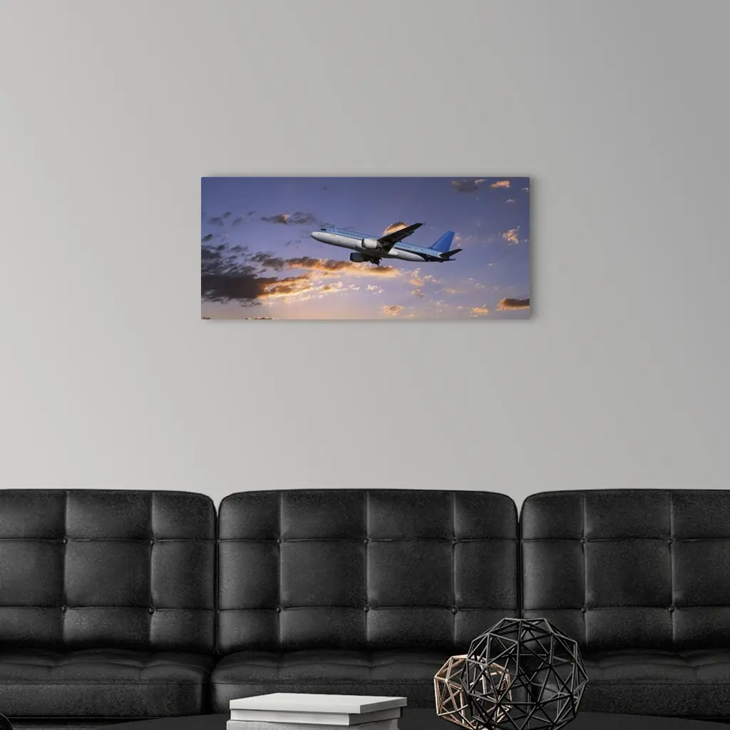 A commercial airplane is pictured from below as it soars through a sunset lit sky.