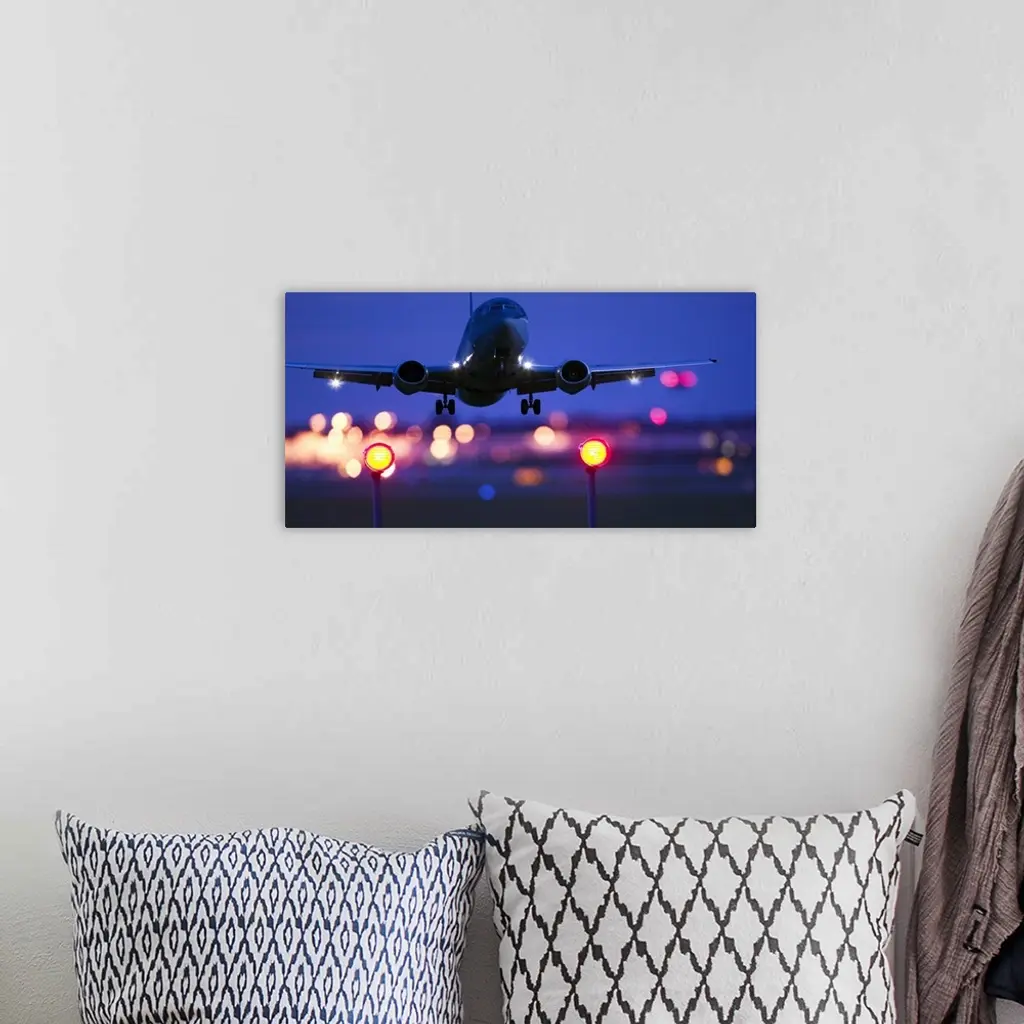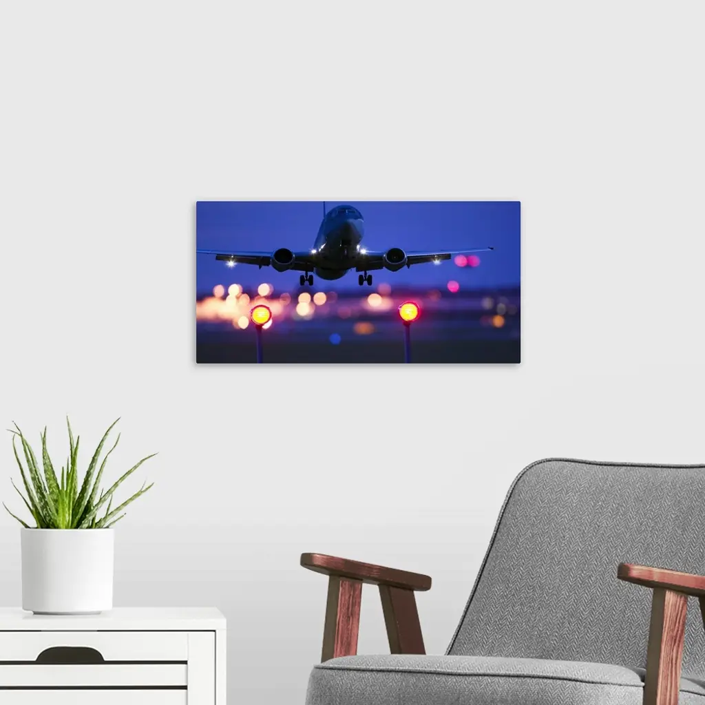 An Airplane Landing With Blurred Lights Of The Airport In The Background