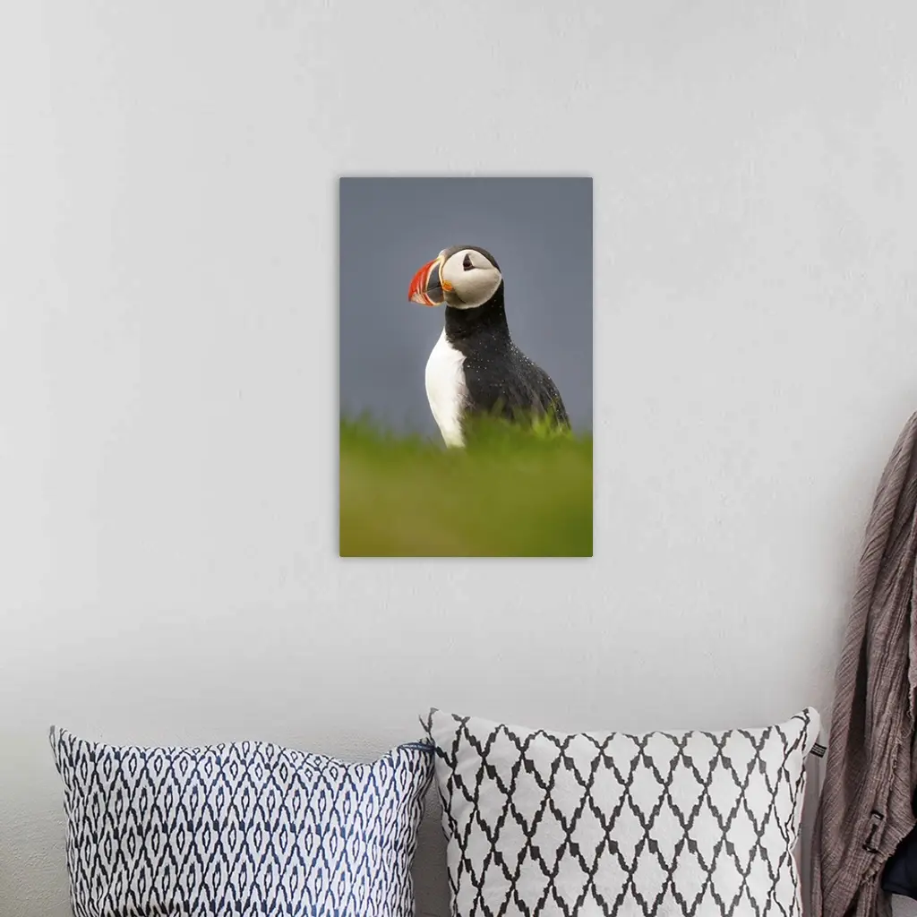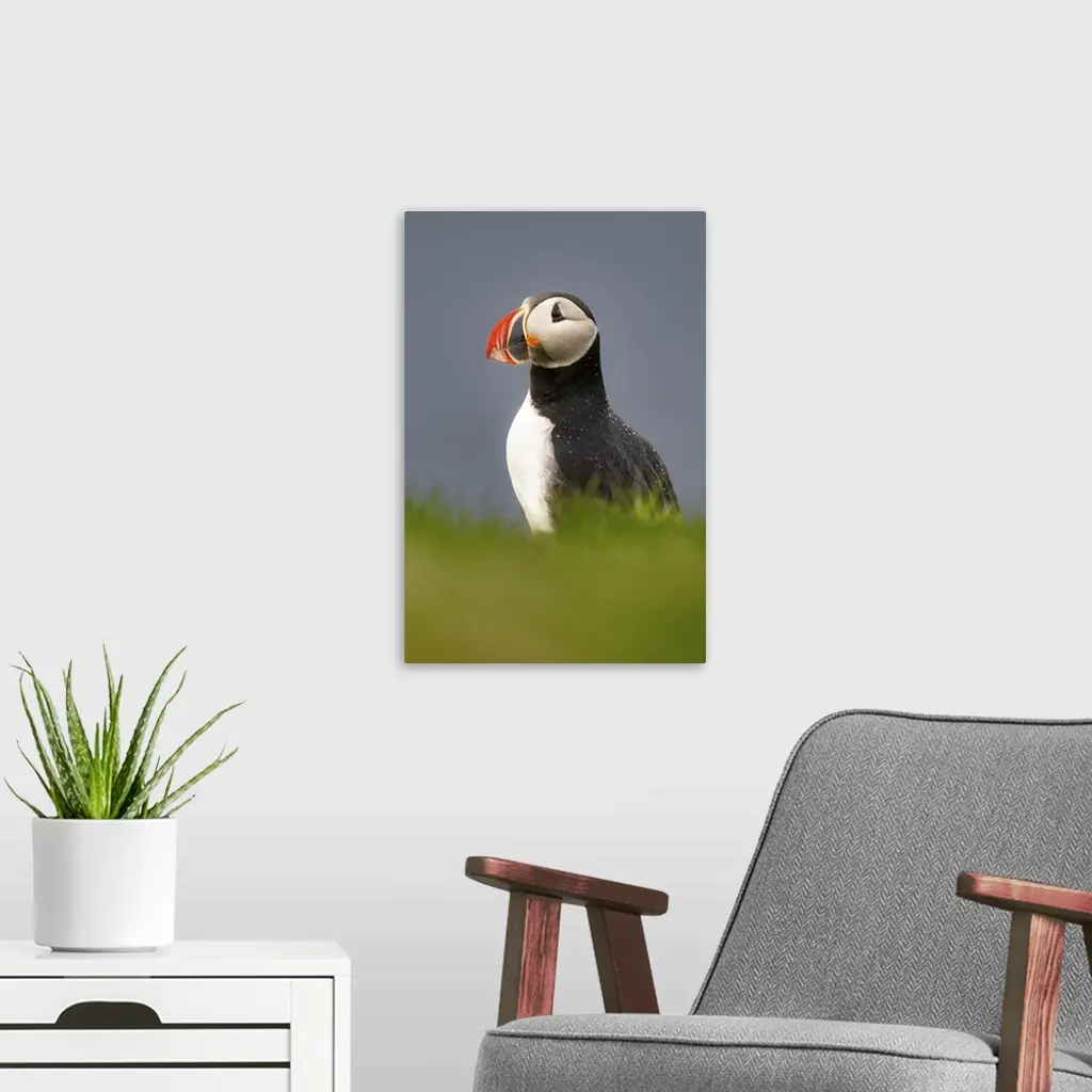 An Atlantic Puffin (Fratercula arctica), on a cliff edge in Westman Islands, Iceland, Polar Regions