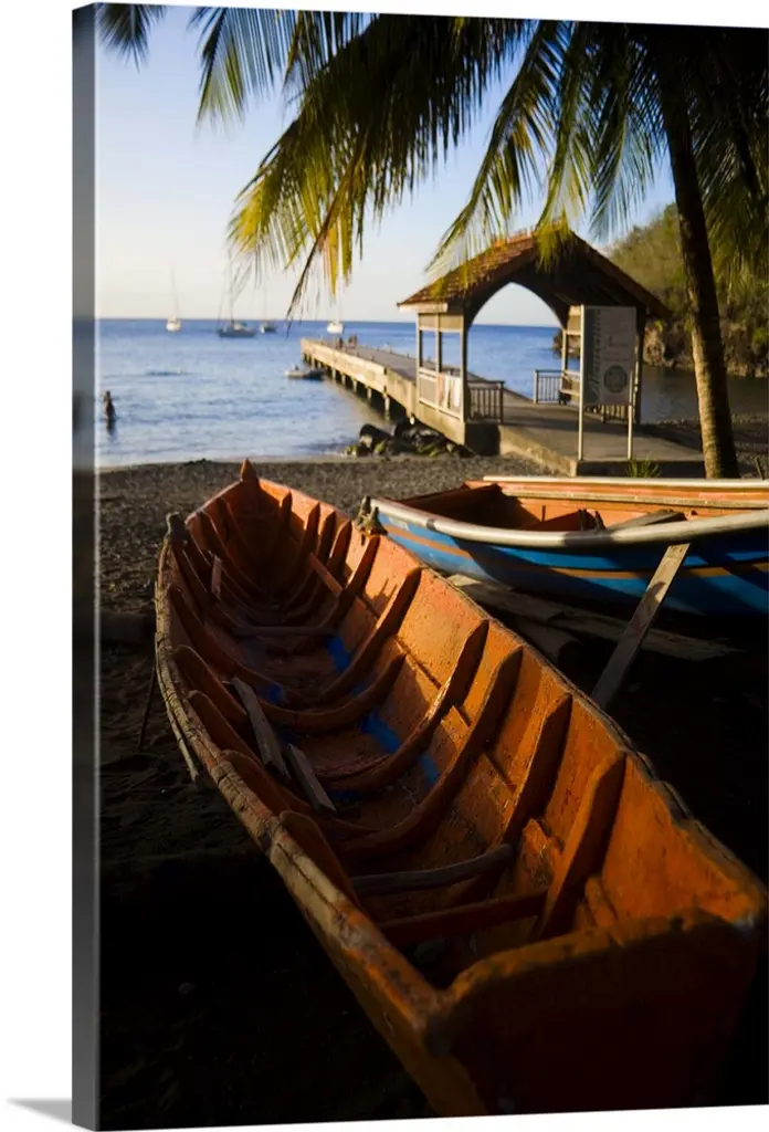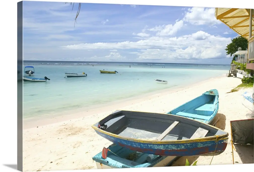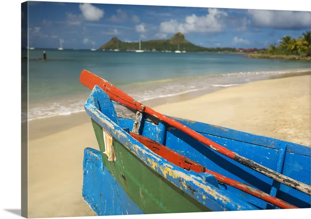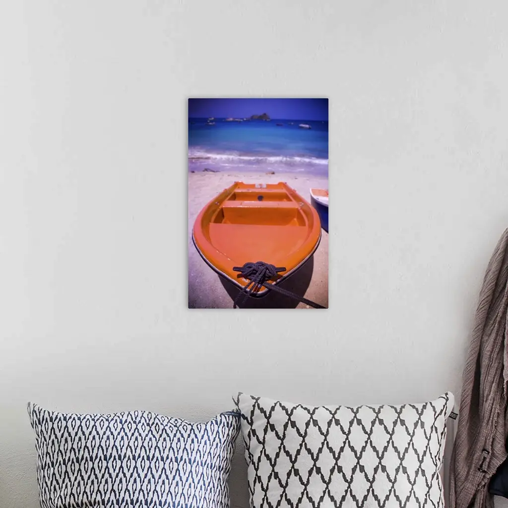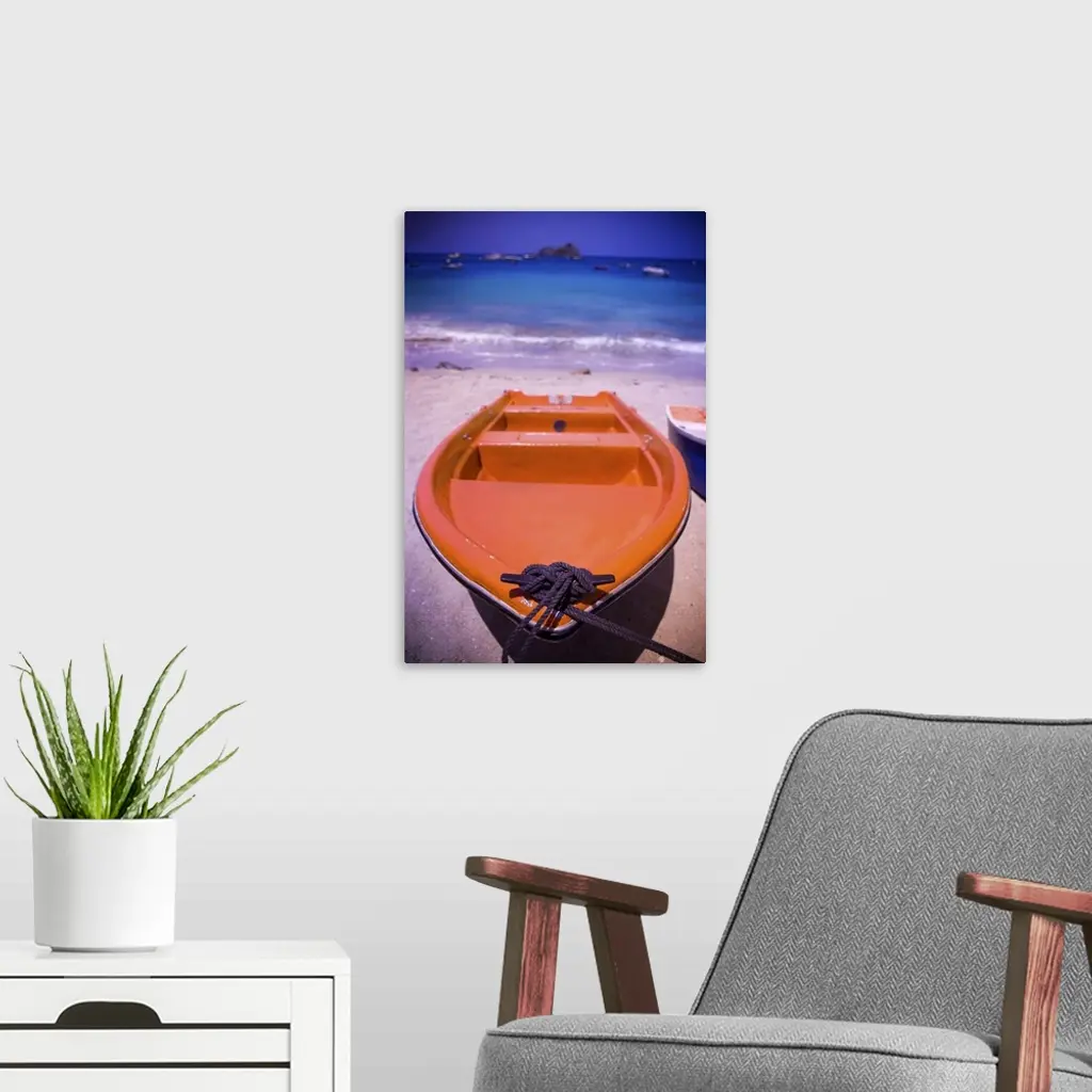 An colorful orange row boat on a Caribbean beach in front of the turqoise Caribbean Sea.