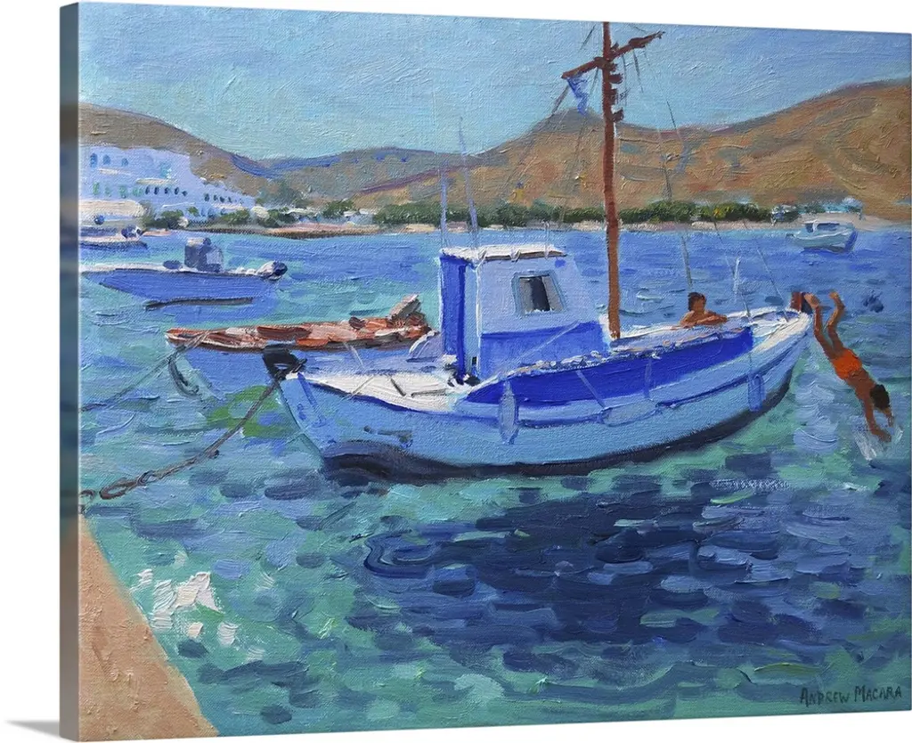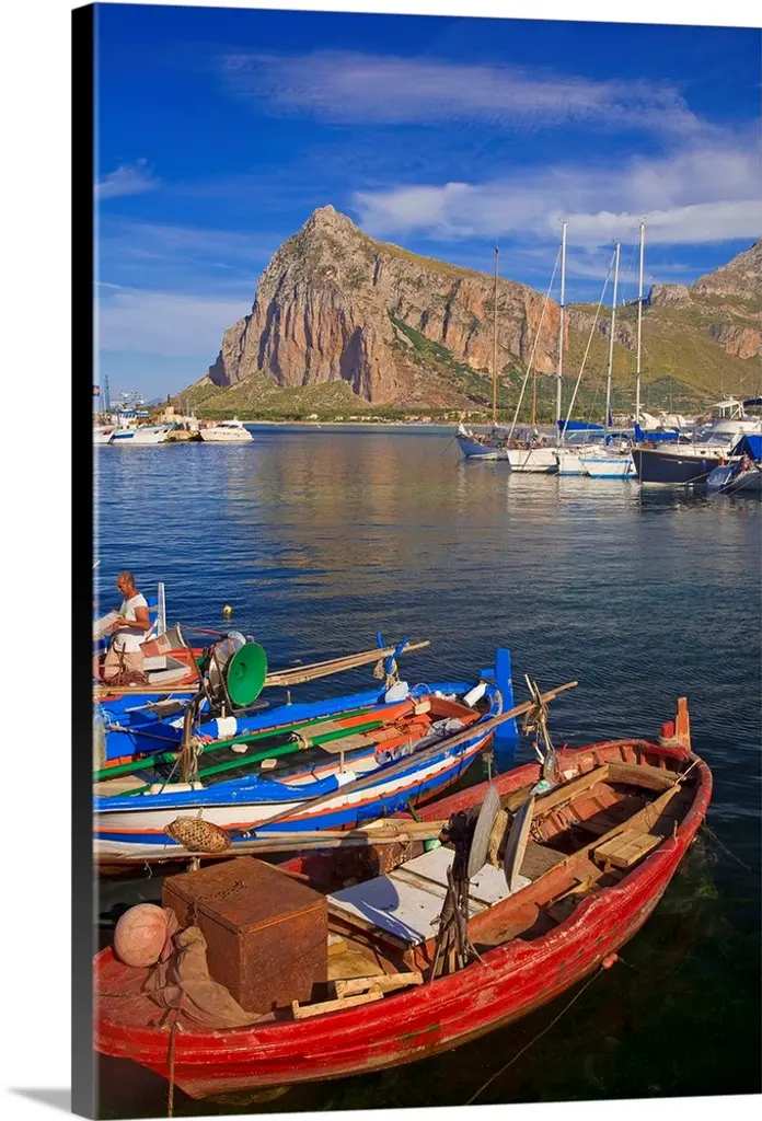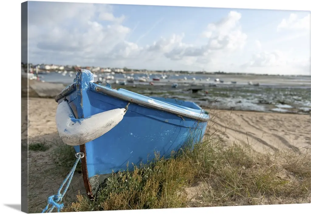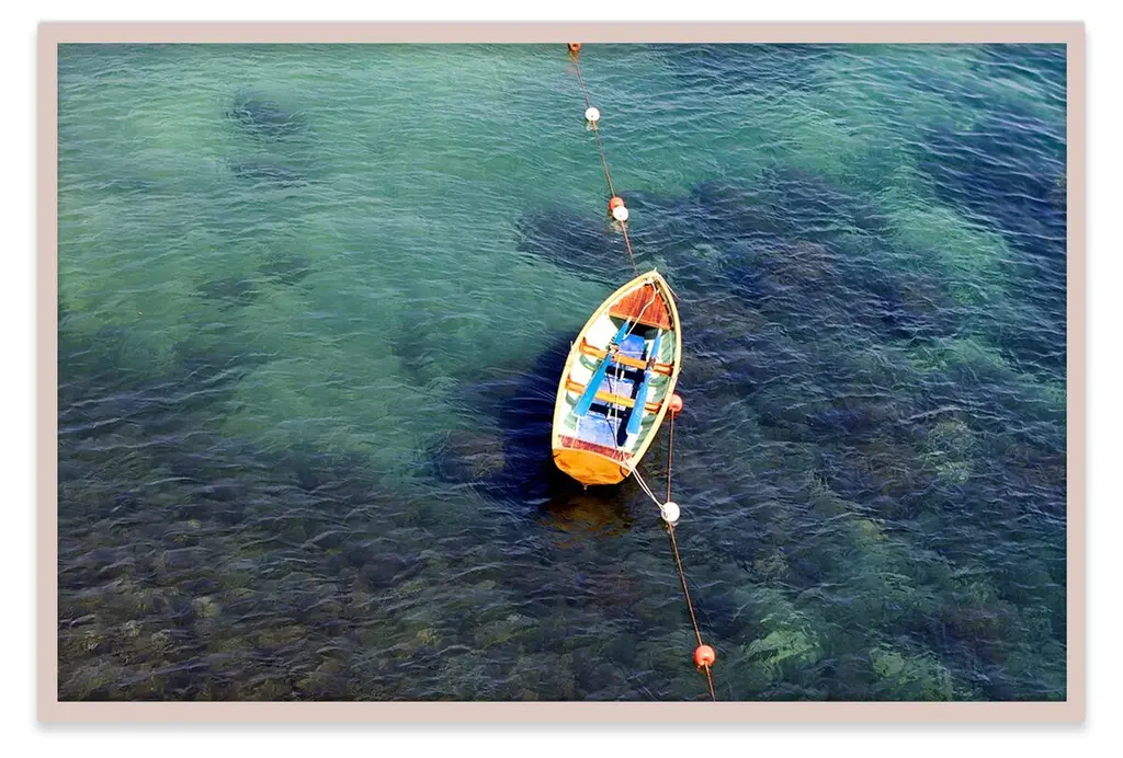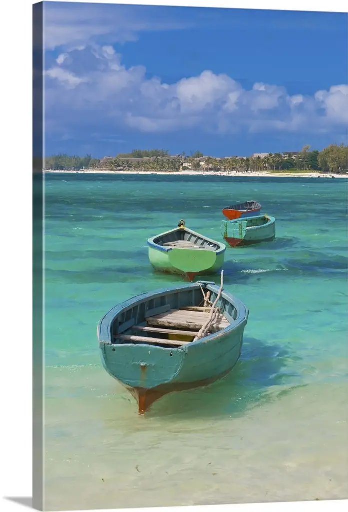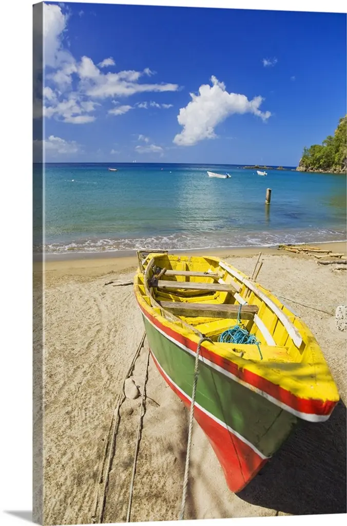 An colorful orange row boat on a Caribbean beach in front of the turqoise Caribbean Sea.