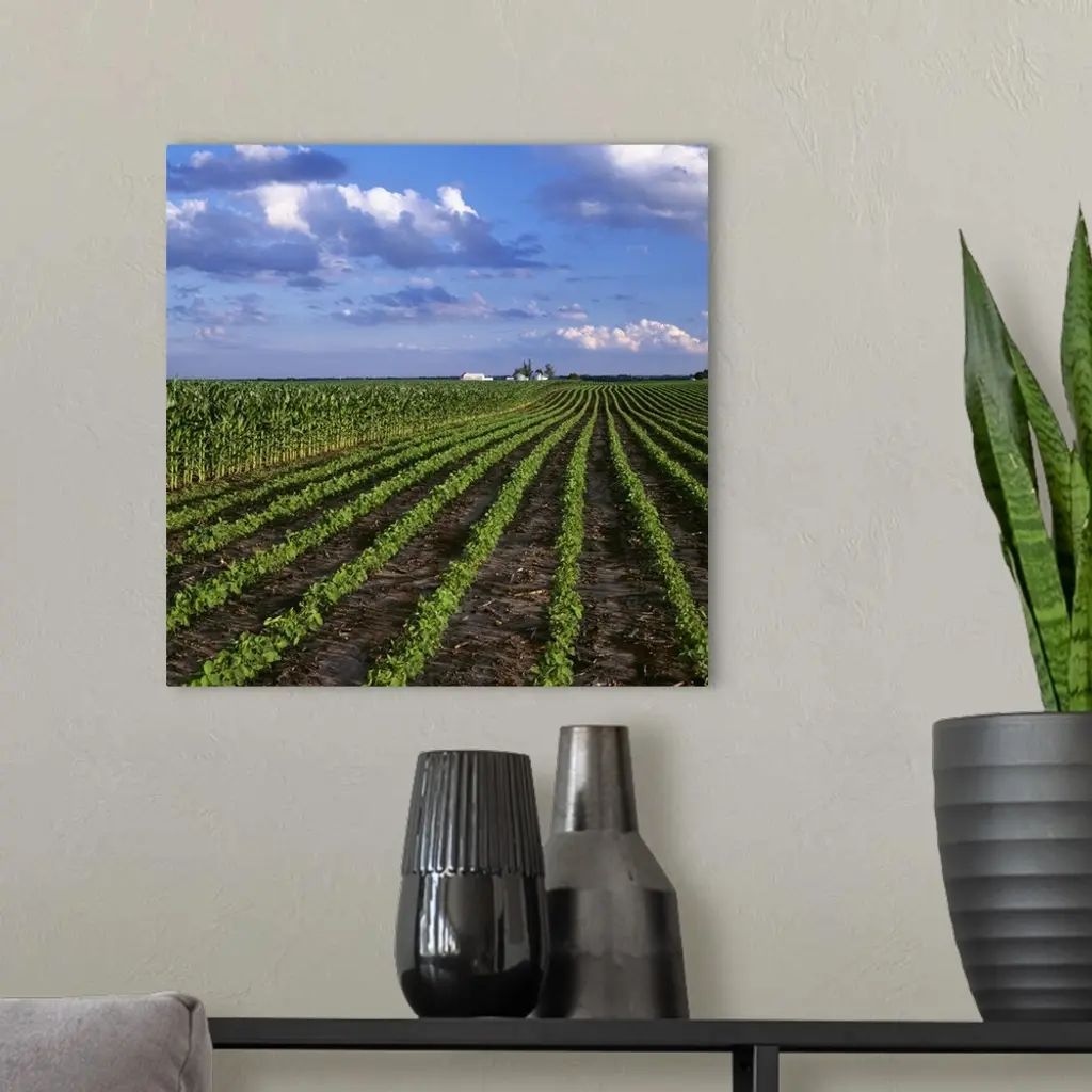 An early growth soybean field grows next to a mid growth field of grain corn wall art for home and office decor. Discover canvas art prints, photos, mural, big canvas art and framed wall art in GreatBigCanvas.com's varied collections.