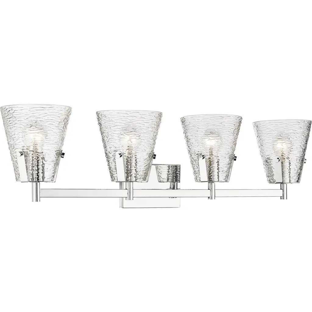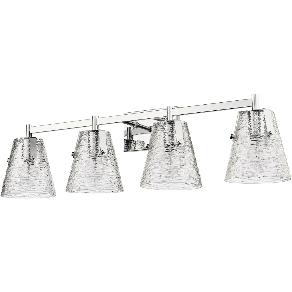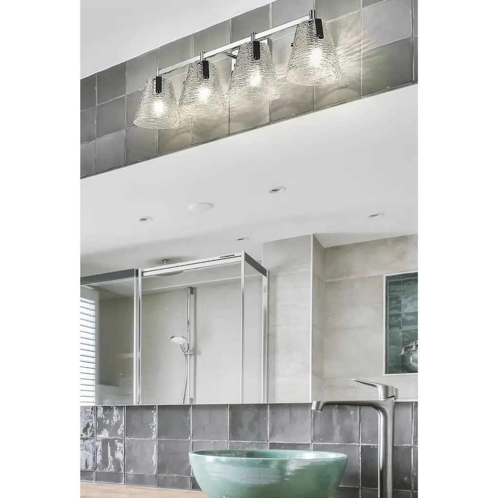 Energize a custom modern bath space with this four-light vanity bath light, embracing the radiant look of hand-blown clear textured glass. Ideal for both contemporary or transitional spaces, this vanity light from the Analia collection merges a hint of nautical style with conical shades and industrial-inspired details. A brilliant chrome finish steel frame reflects a minimalist style with glam and elegance.