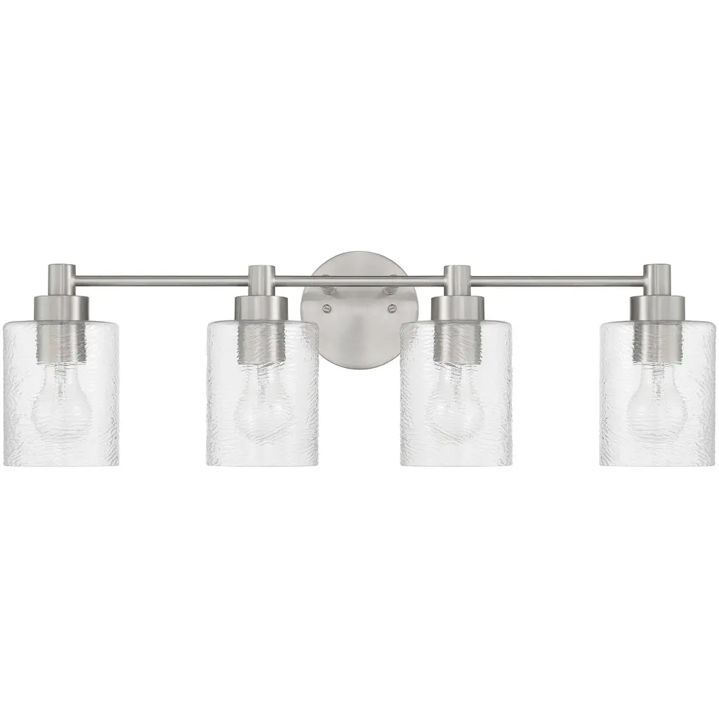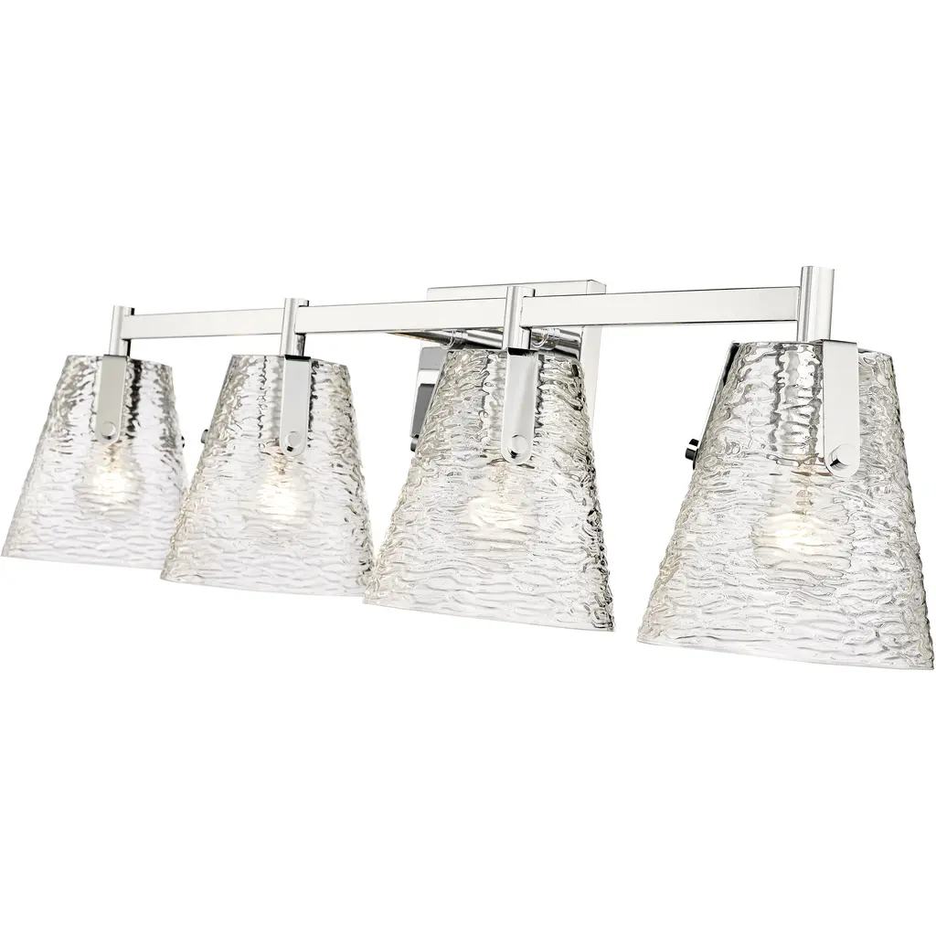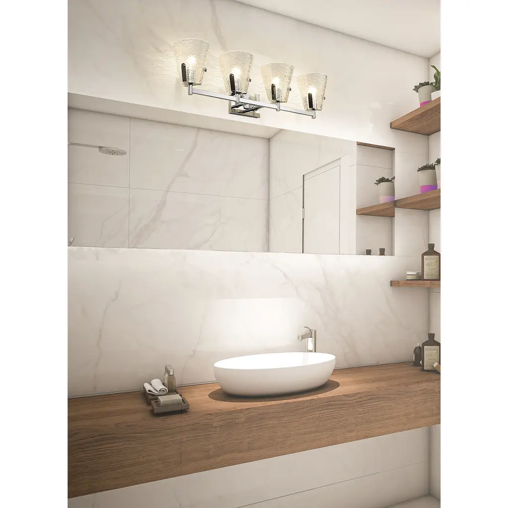 Energize a custom modern bath space with this four-light vanity bath light, embracing the radiant look of hand-blown clear textured glass. Ideal for both contemporary or transitional spaces, this vanity light from the Analia collection merges a hint of nautical style with conical shades and industrial-inspired details. A brilliant chrome finish steel frame reflects a minimalist style with glam and elegance.
