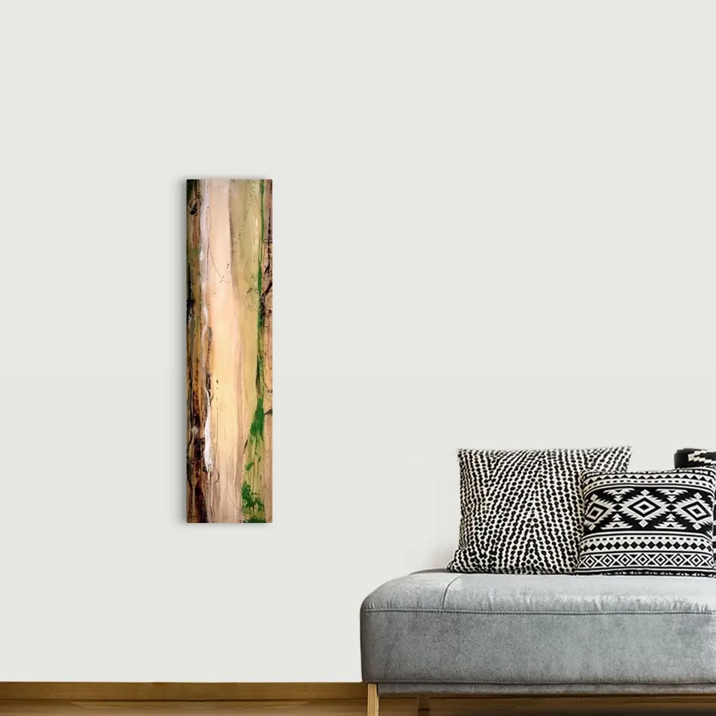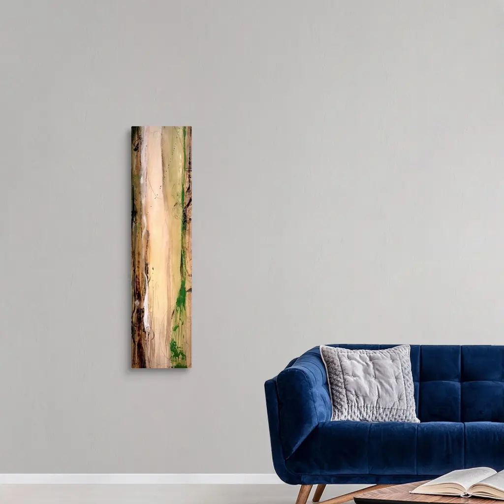 Panoramic abstract art incorporates the use of earth tones and lots of vertical lines that illicit movement as someone looks at it.