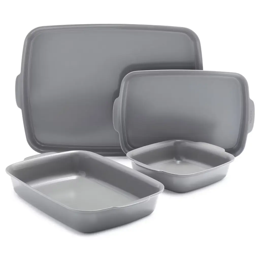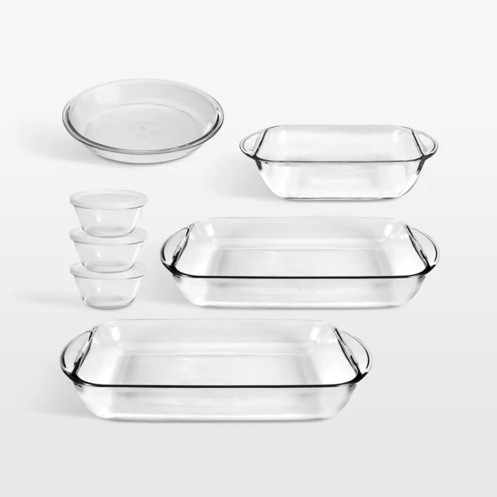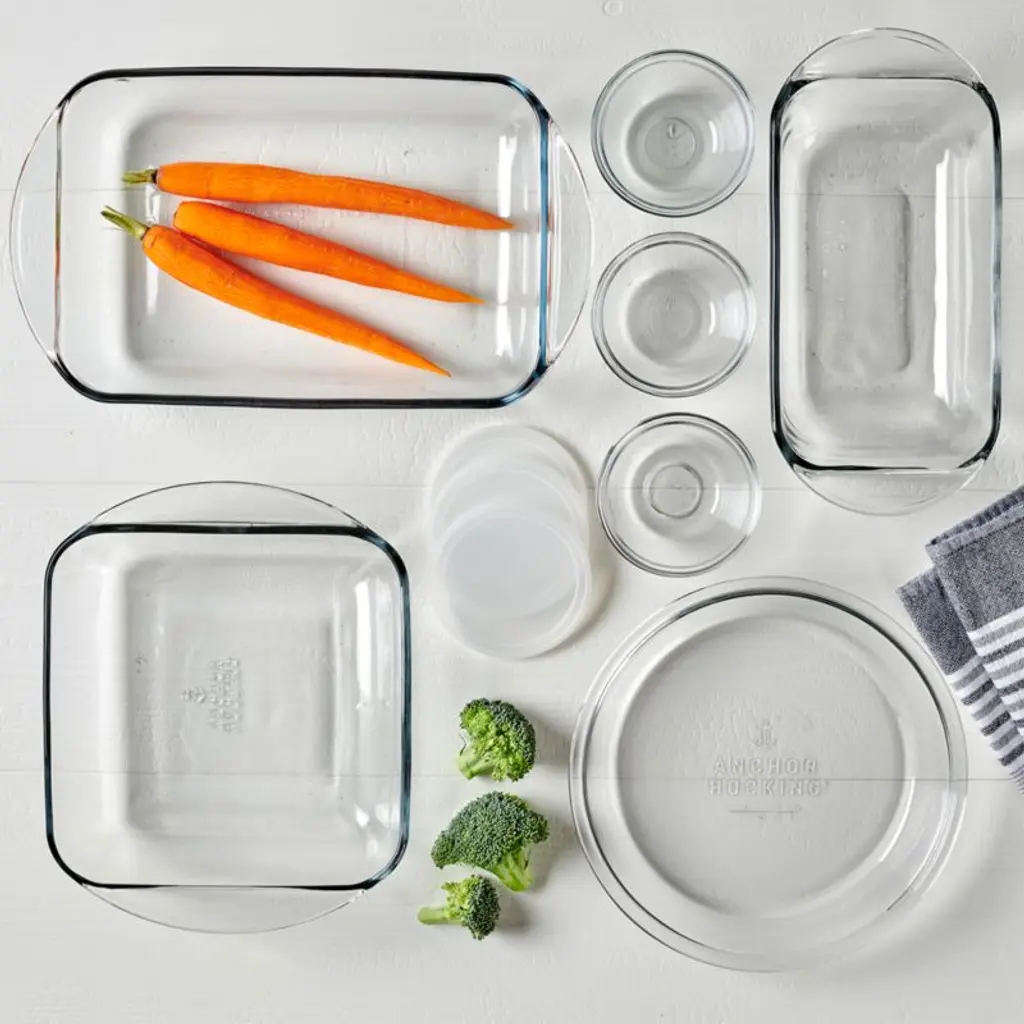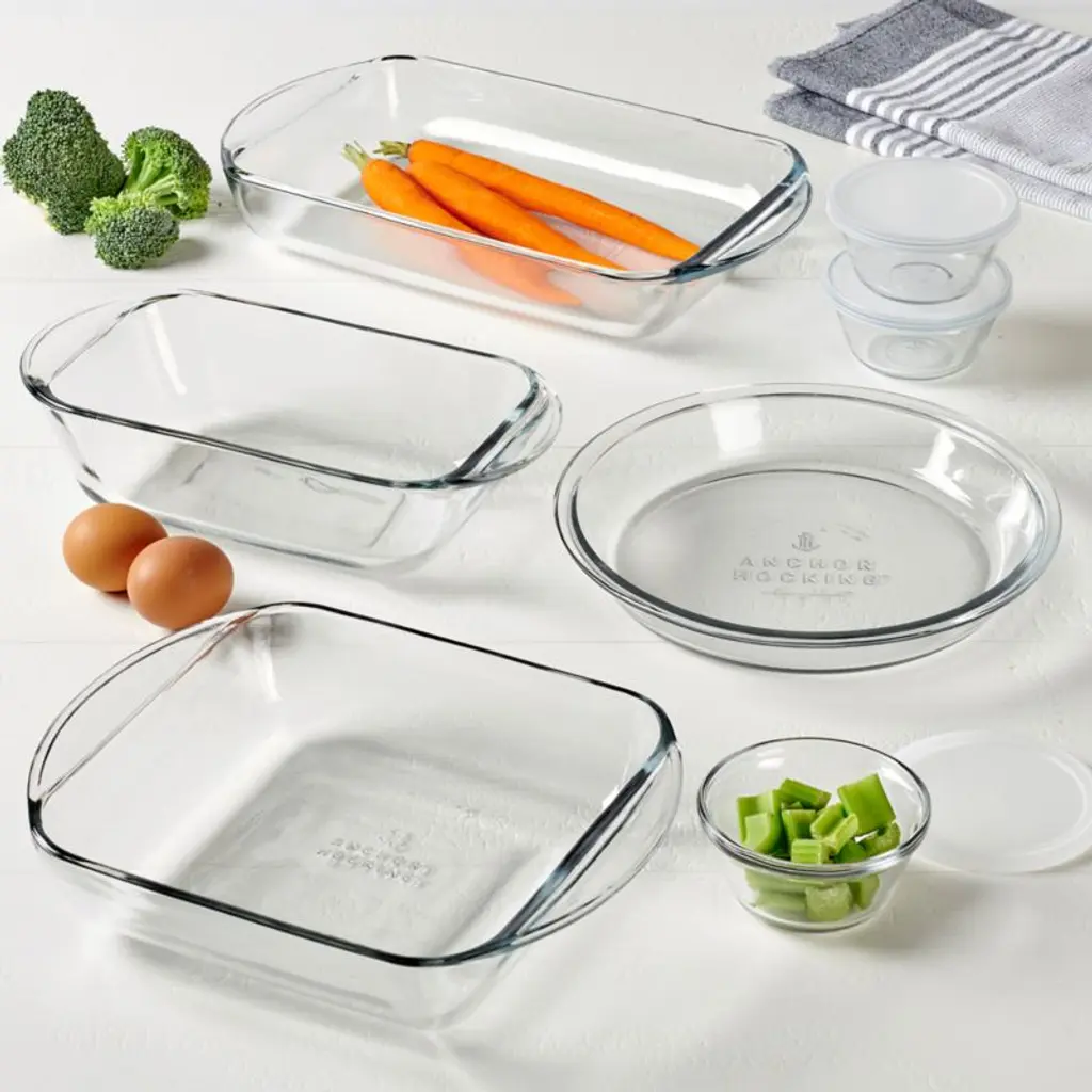 Cook, serve and store with this essential bakeware set. Made of microwave-, oven- and dishwasher-safe clear glass, the set has everything you need to cook casseroles, meatloaf, quick breads, pies and custard.Anchor Hocking has been crafting high-quality glassware since 1905.