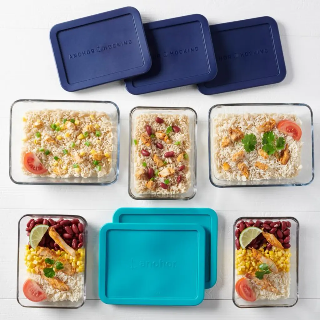 Bake, store and transport with this versatile storage set that goes from oven to table or potluck. Five rectangular containers in two sizesthree 3-cup and two 6-cupaccommodate fresh fruit, leftovers, pack-and-go lunches and anything else that needs storing. Navy blue lids for the smaller size and teal for the larger provide a secure seal and make it organize stored contents by food type.Anchor Hocking has been crafting high-quality glassware since 1905.