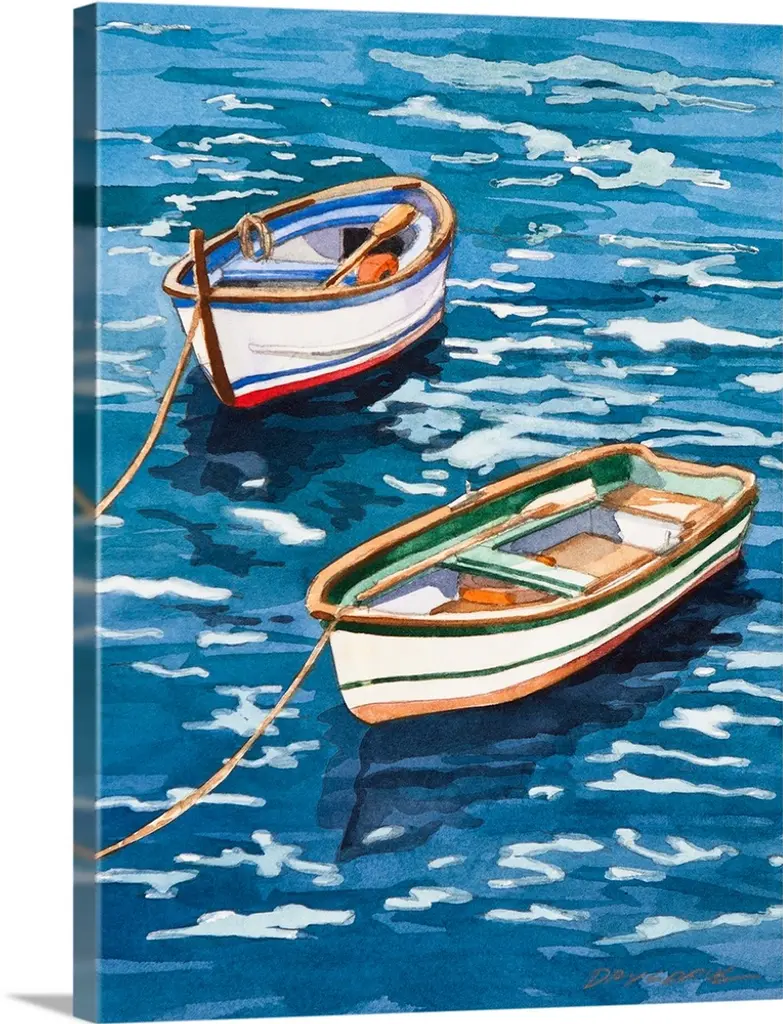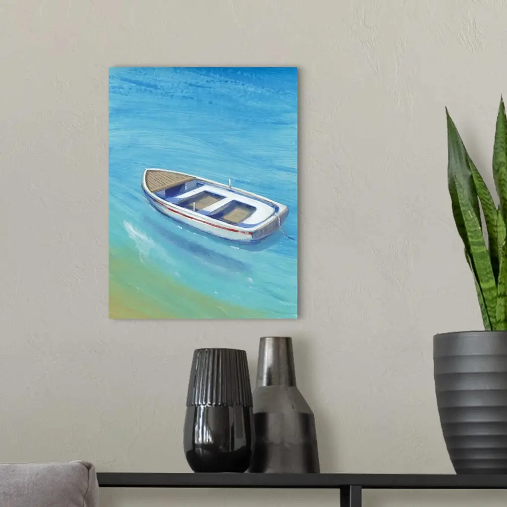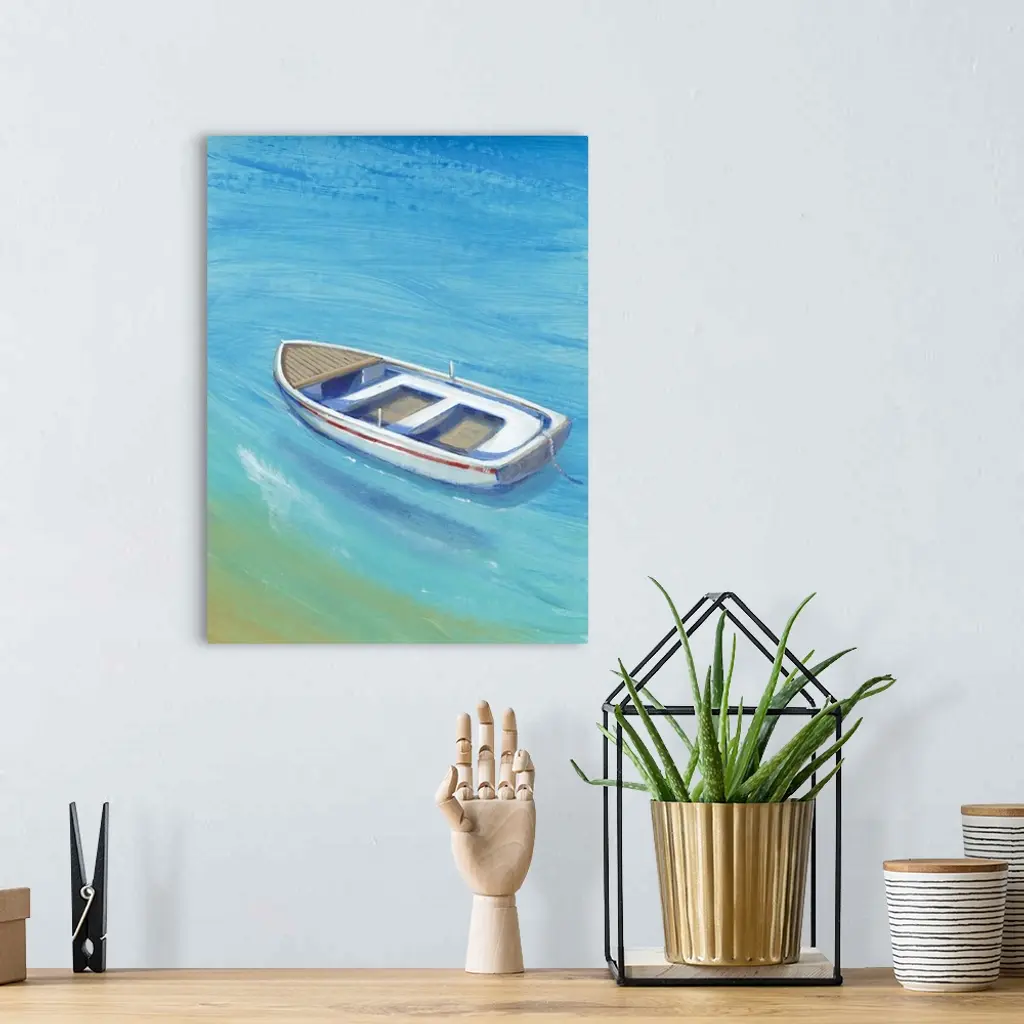 A quaint, little white and red boat anchored in brilliant, calm blue water.