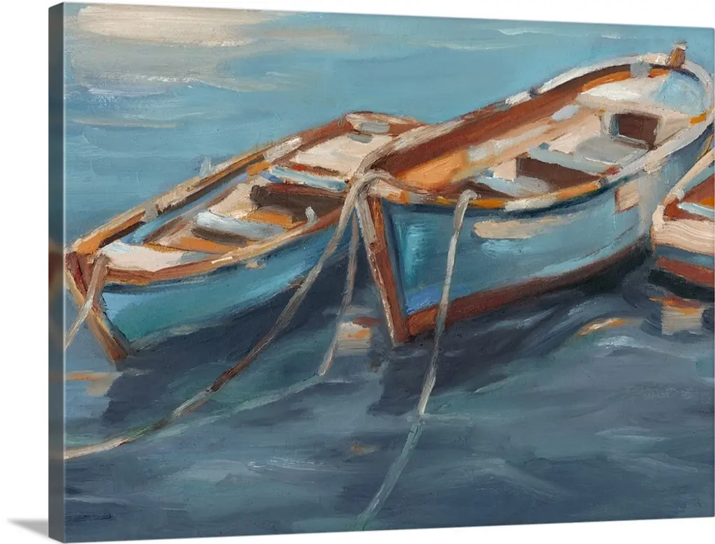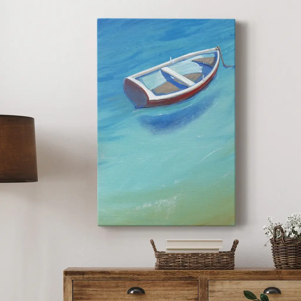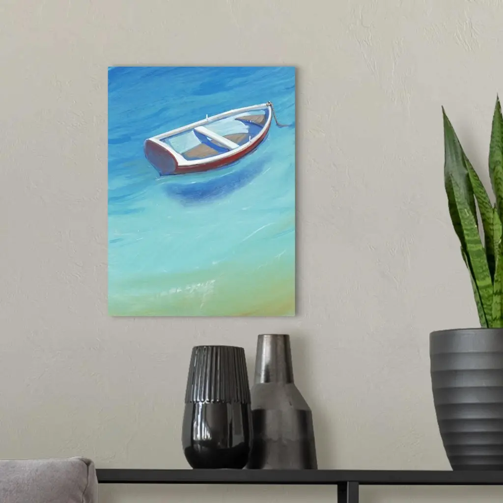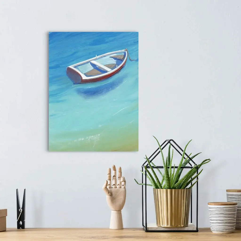 A quaint, little white and red boat anchored in brilliant, calm blue water.