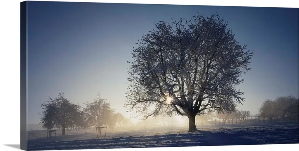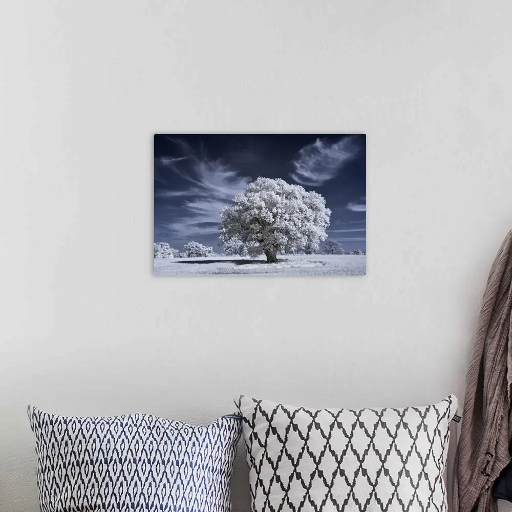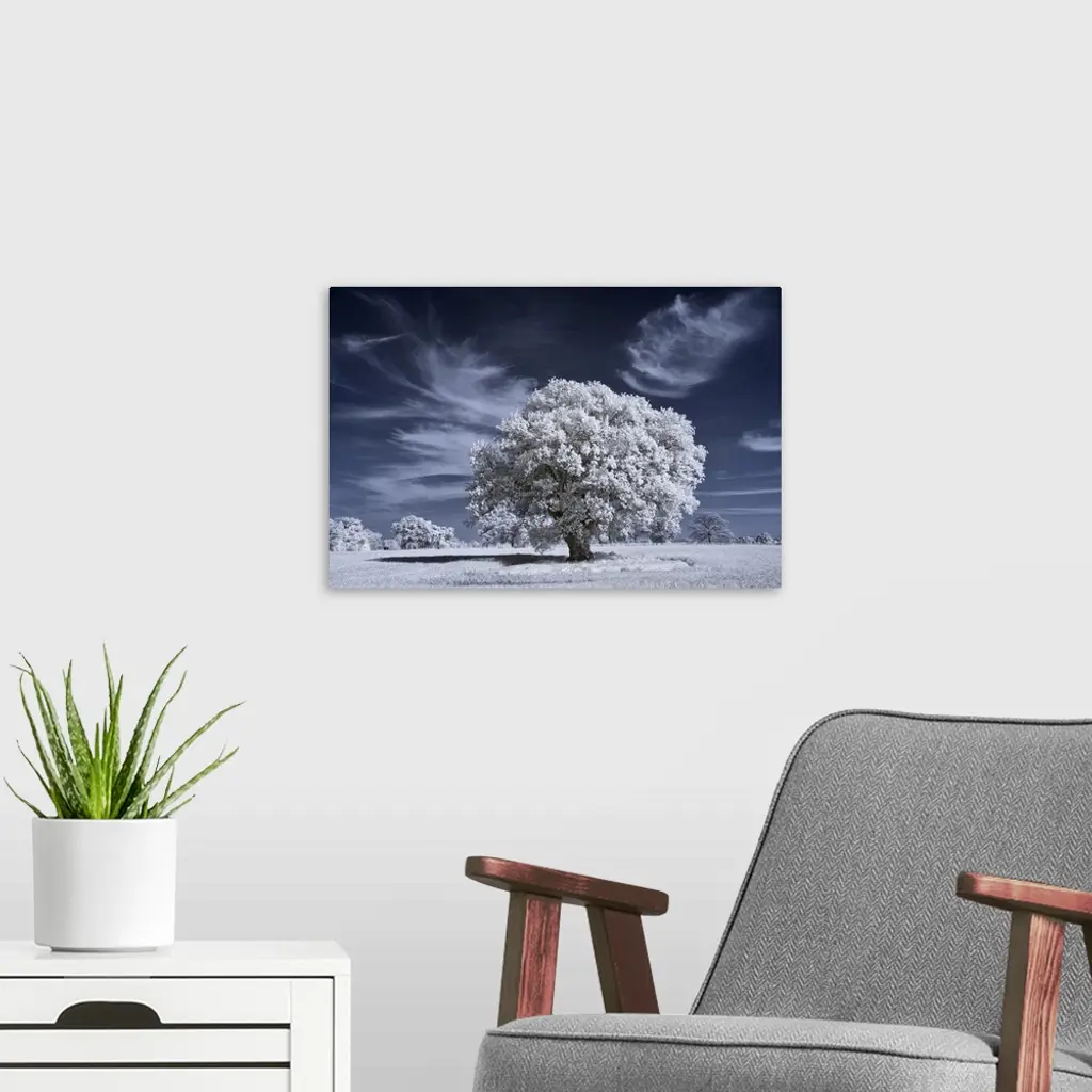 Ancient oak tree in infrared with white foliage against a deep blue sky.