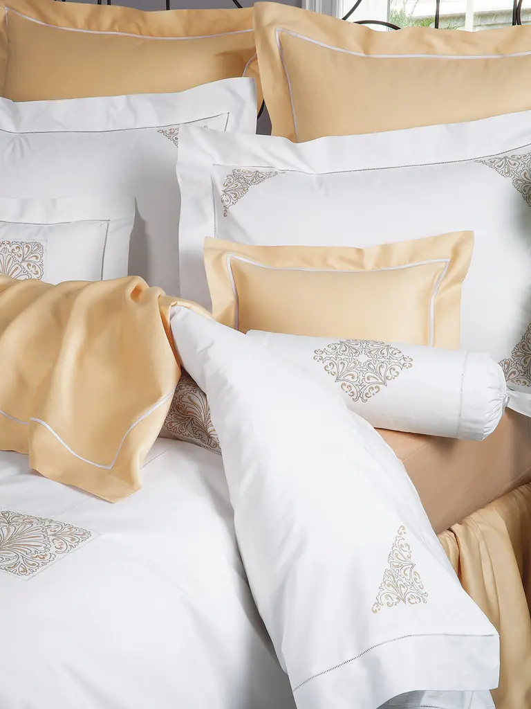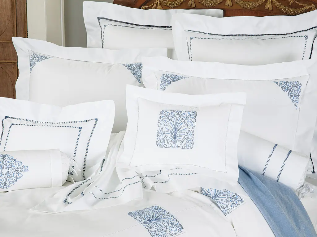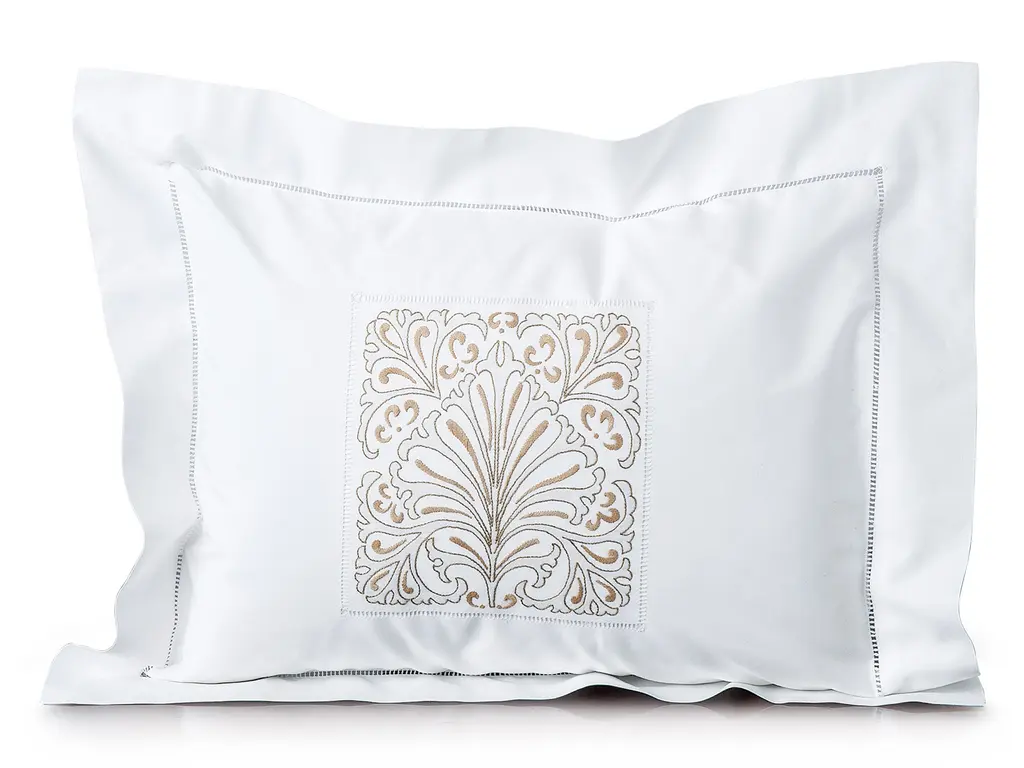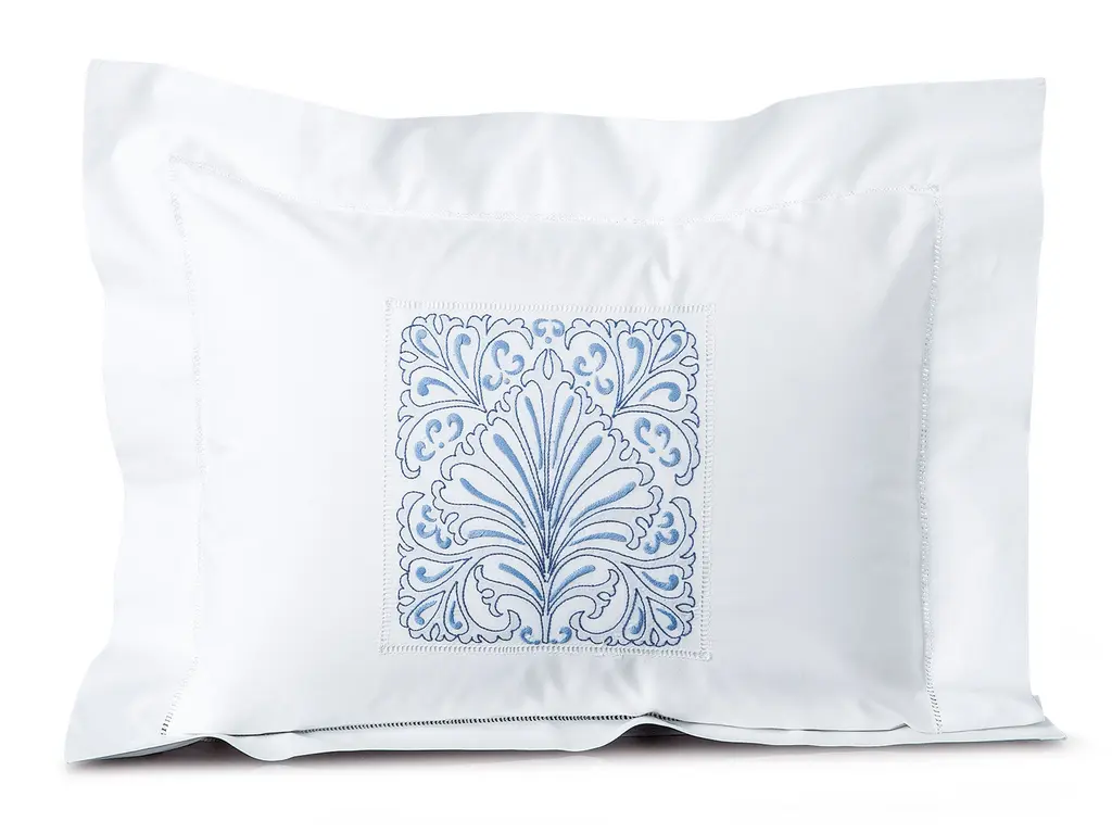 Inspired by the ebb and flow of the ethereal tide, softly edged rectangles have been impeccably embroidered, on fine 600 thread count Egyptian cotton percale from Italy, in a flourishing pattern of varying scales and proportions. Every room feels more at peace and in balance while gentle hues and a pristine attention to detail add a unique beauty like no other. Button enclosures add yet another charming detail to this magnificent piece. Available in Blue or Beige. Imported.