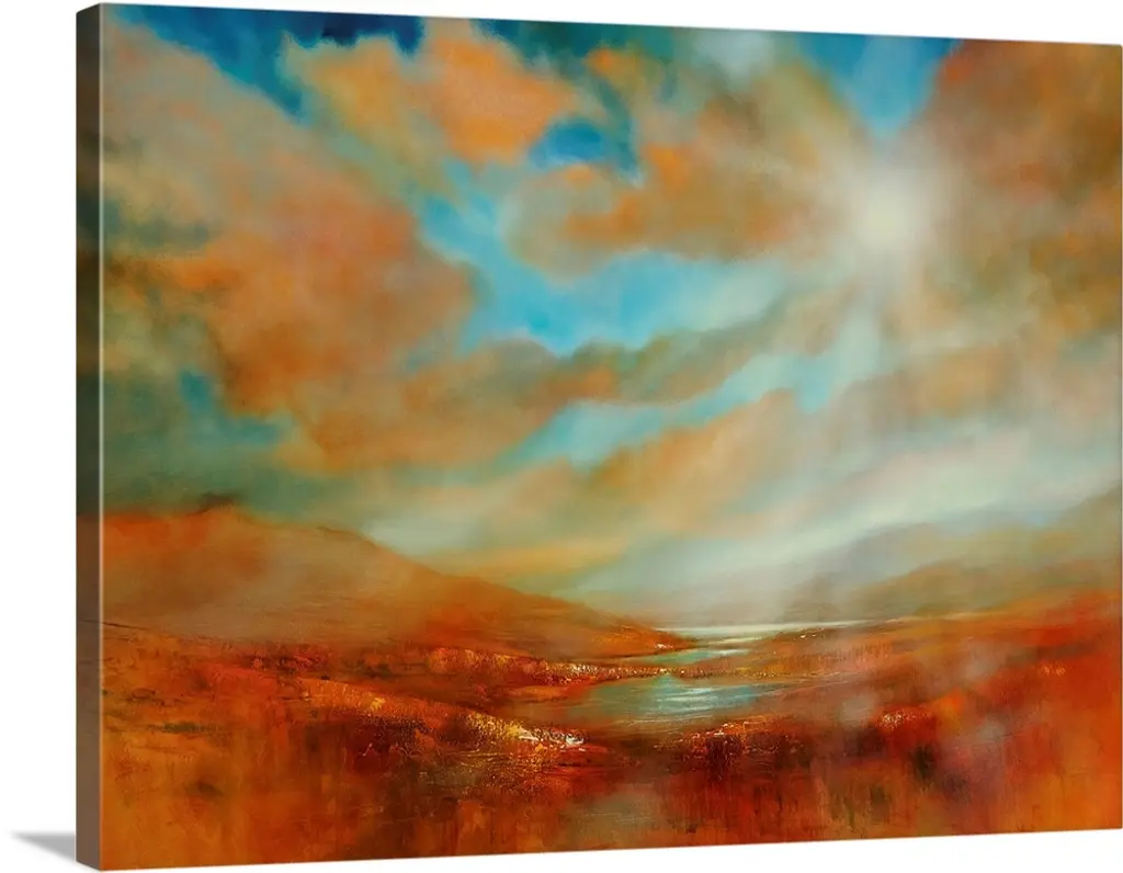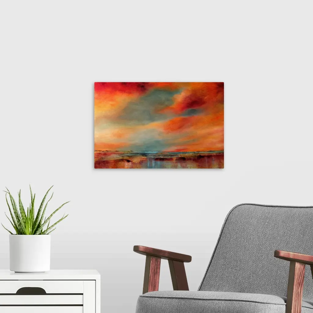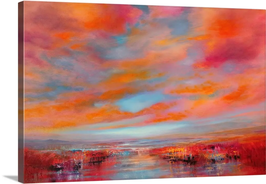 Abstract painted landscape with vivid structures. Wide horizon, clouds, bright light, a river with coastlines that are reflected in the water. Intense blue, orange and red