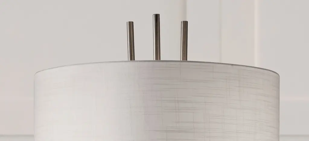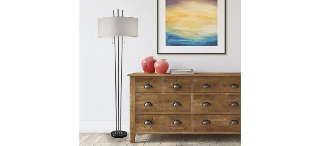 Three brushed steel poles extend through a beautifully textured fabric shade creating the unique, yet elegant silhouette of the Anderson Floor Lamp. A double socket holds two 100 Watt bulbs that can be turned on and off with double pull chain switches. A marble base adds a decorative accent to the simple style.