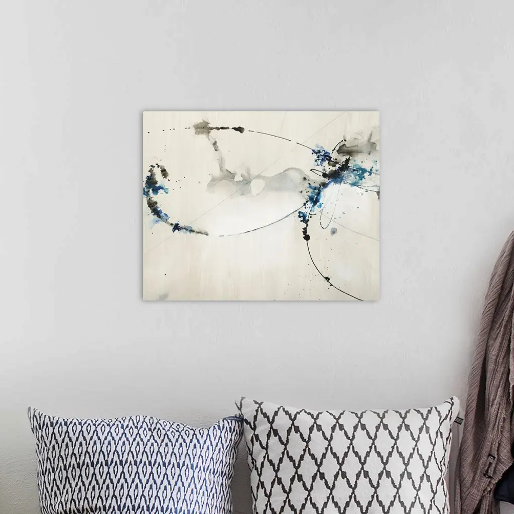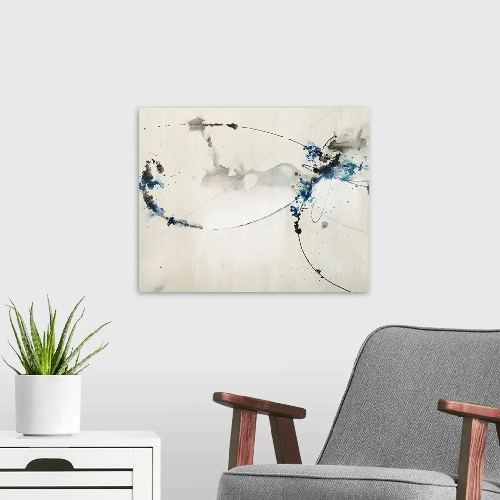 Abstract art with a neutral colored background, black paint splotches and thin black lines with blue paint on top.