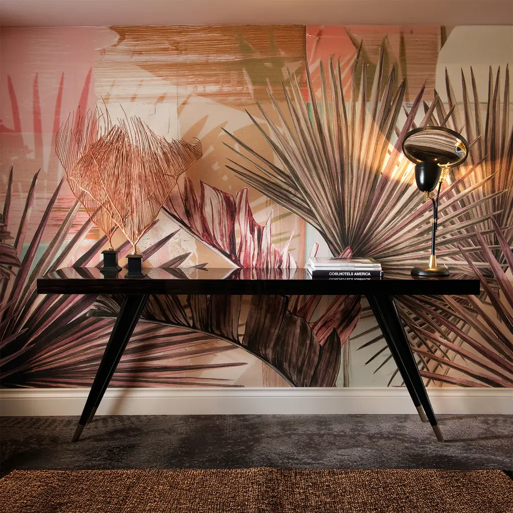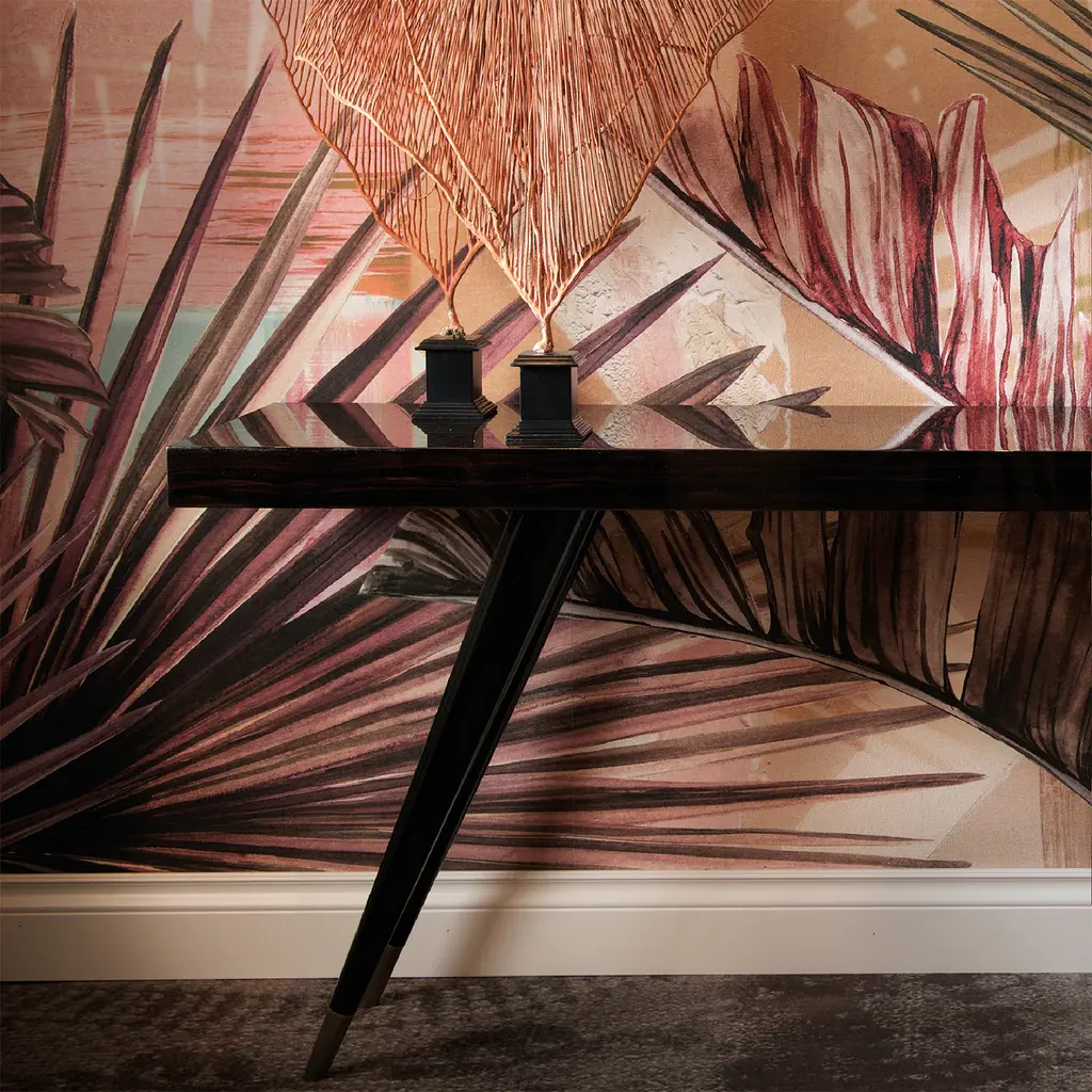 Part of the stunning Andrea series, this console is a superb welcoming piece to add in a modern entryway and can be used as extra display surface behind a sofa in the living room or study. Its elegant silhouette comprises slanted legs and a 7 cm-thick top. Entirely crafted of Macassar ebony, its tips are accented in bronzed metal, while the legs are given a glossy black lacquer. This timeless object of functional decor can be combined with others in the same series for a complete effect.