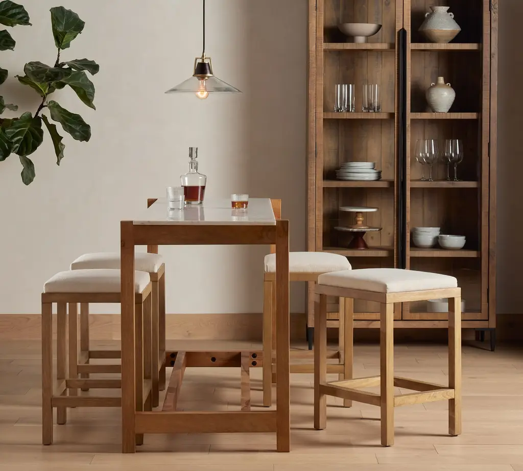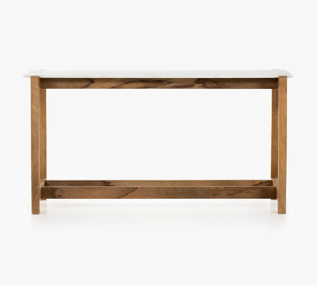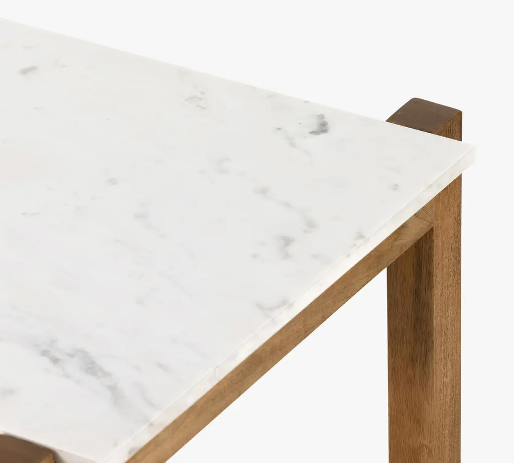 With its clean lines and eye-catching mix of materials, this table makes a perfect addition to your kitchen or outdoor space. Solid white marble rests in an auburn-finished mango wood frame for a modern take on farmhouse style. Slightly elevated, it has an open structure and streamlined design great for smaller spaces.