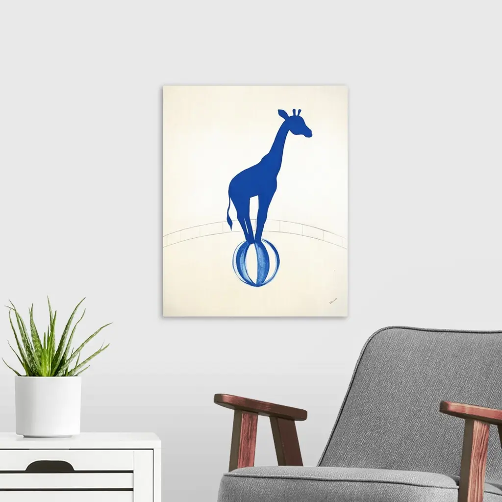 Blue silhouette of a giraffe balancing on a striped ball in a graphite drawn ring.