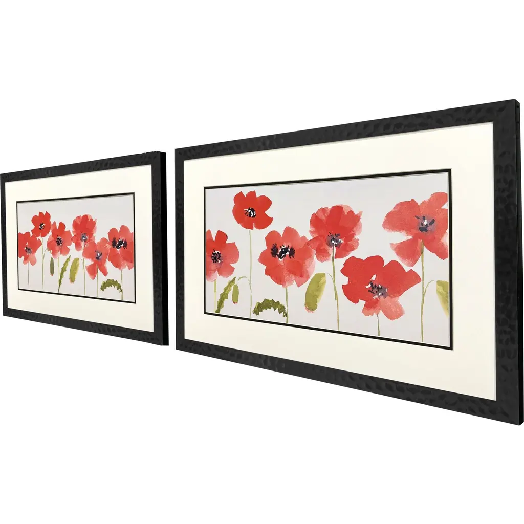 Dazzling red anemones are accented with white and black matting. They are framed in a lacquered black finish molding with honeycomb embossing.