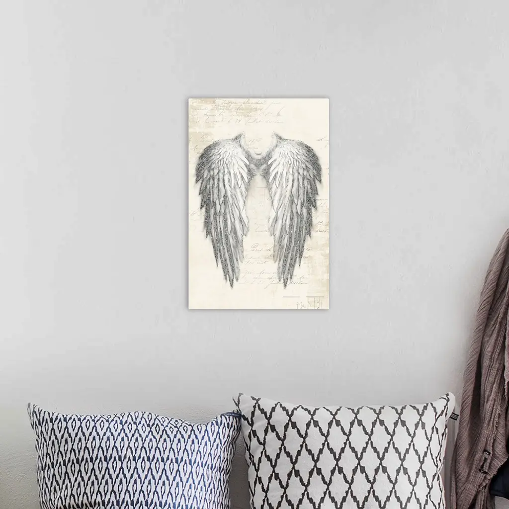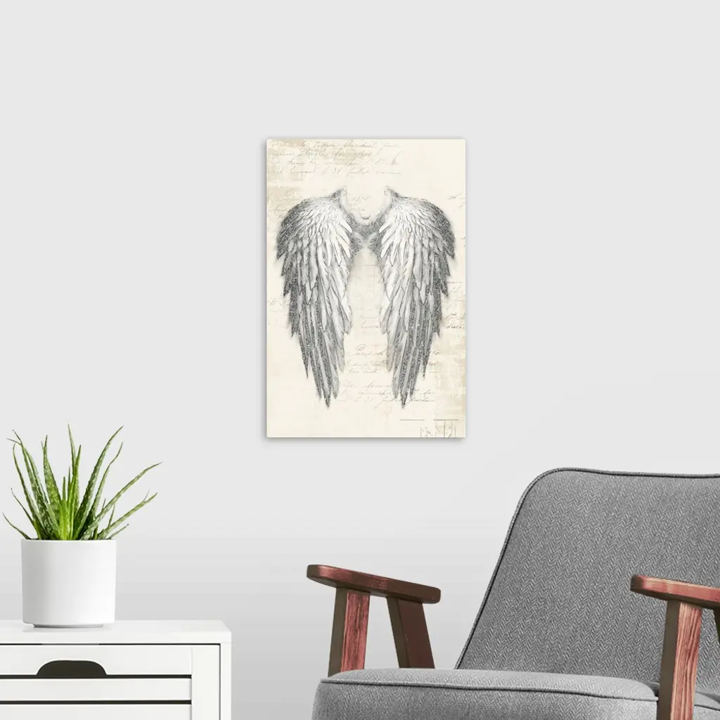 A vertical drawing of a pain of angel wings with metallic sliver accents on a neutral backdrop with handwritten text.