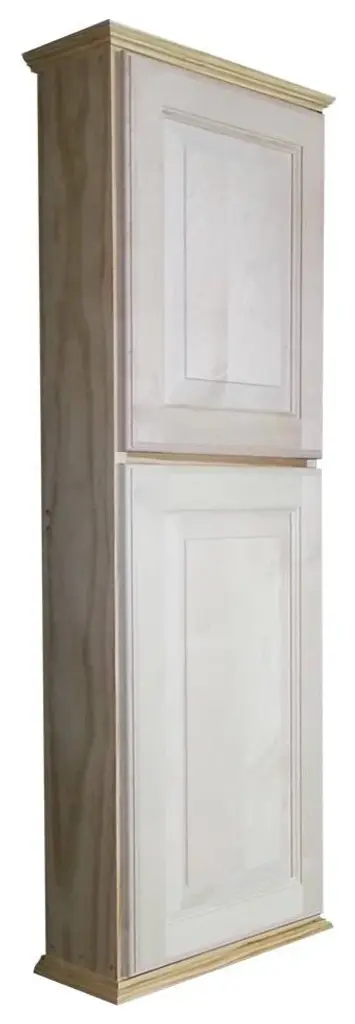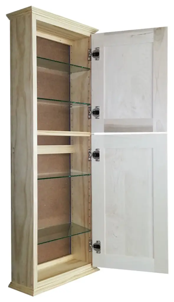 Mounts on the wall with steel mounting brackets inside for an easy installation. With two mounting methods, there is no need to worry about where the studs are in the wall. Five fully adjustable glass shelves slide into our patented shelf supports so they don''t tip or rock. Raised panel door sits on concealed hinges with soft close feature, door is reversible so you can mount it to open either direction. Perfect as a medicine cabinet, spice cabinet, or storage cabinet anywhere. OVERALL Measurements are 43.5h x 15.5w x 3.25"d OVERALL. You''ll have nearly 2.5" of depth INSIDE the cabinet. Unfinished bare wood can be painted or stained as desired. Solid pine cabinet box with solid maple door. Proudly made in Sarasota, FL.
