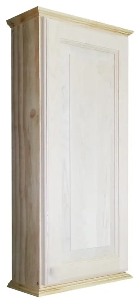 Mounts on the wall with steel mounting brackets inside for an easy installation. With two mounting methods, there is no need to worry about where the studs are in the wall. Five fully adjustable glass shelves slide into our patented shelf supports so they don''t tip or rock. Raised panel door sits on concealed hinges with soft close feature, door is reversible so you can mount it to open either direction. Perfect as a medicine cabinet, spice cabinet, or storage cabinet anywhere. OVERALL Measurements are 43.5h x 15.5w x 4.25"d OVERALL. You''ll have nearly 3.5" of depth INSIDE the cabinet. Unfinished bare wood can be painted or stained as desired. Solid pine cabinet box with solid maple door. Proudly made in Sarasota, FL.