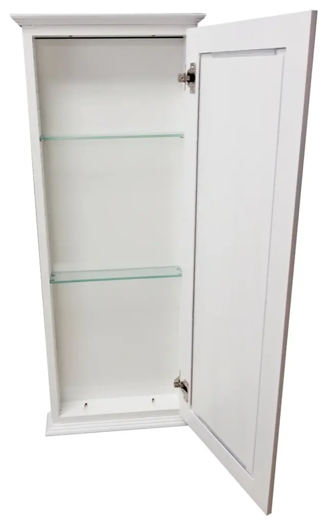 Mounts on the wall with steel mounting brackets inside for an easy installation. With two mounting methods, there is no need to worry about where the studs are in the wall. Five fully adjustable glass shelves slide into our patented shelf supports so they don''t tip or rock. Raised panel door sits on concealed hinges with soft close feature, door is reversible so you can mount it to open either direction. Perfect as a medicine cabinet, spice cabinet, or storage cabinet anywhere. OVERALL Measurements are 49.5h x 15.5w x 4.25"d OVERALL. You''ll have nearly 3.5" of depth INSIDE the cabinet. White enamel finish. Solid pine cabinet box with solid maple door. Proudly made in Sarasota, FL.