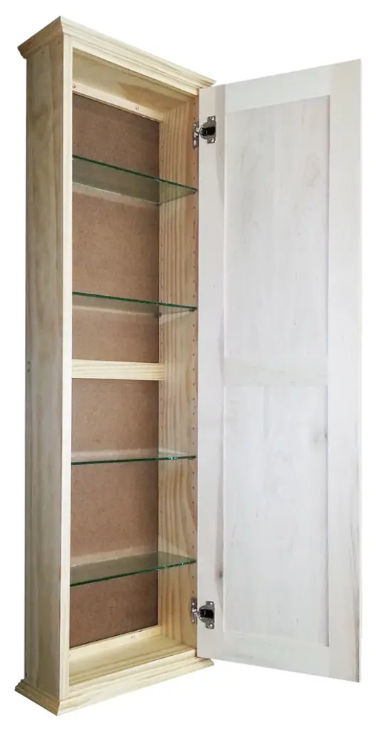 Mounts on the wall with steel mounting brackets inside for an easy installation. With two mounting methods, there is no need to worry about where the studs are in the wall. Five fully adjustable glass shelves slide into our patented shelf supports so they don''t tip or rock. Raised panel door sits on concealed hinges with soft close feature, door is reversible so you can mount it to open either direction. Perfect as a medicine cabinet, spice cabinet, or storage cabinet anywhere. OVERALL Measurements are 49.5h x 15.5w x 8"d OVERALL. You''ll have nearly 7.25" of depth INSIDE the cabinet. Unfinished bare wood can be painted or stained as desired. Solid pine cabinet box with solid maple door. Proudly made in Sarasota, FL.