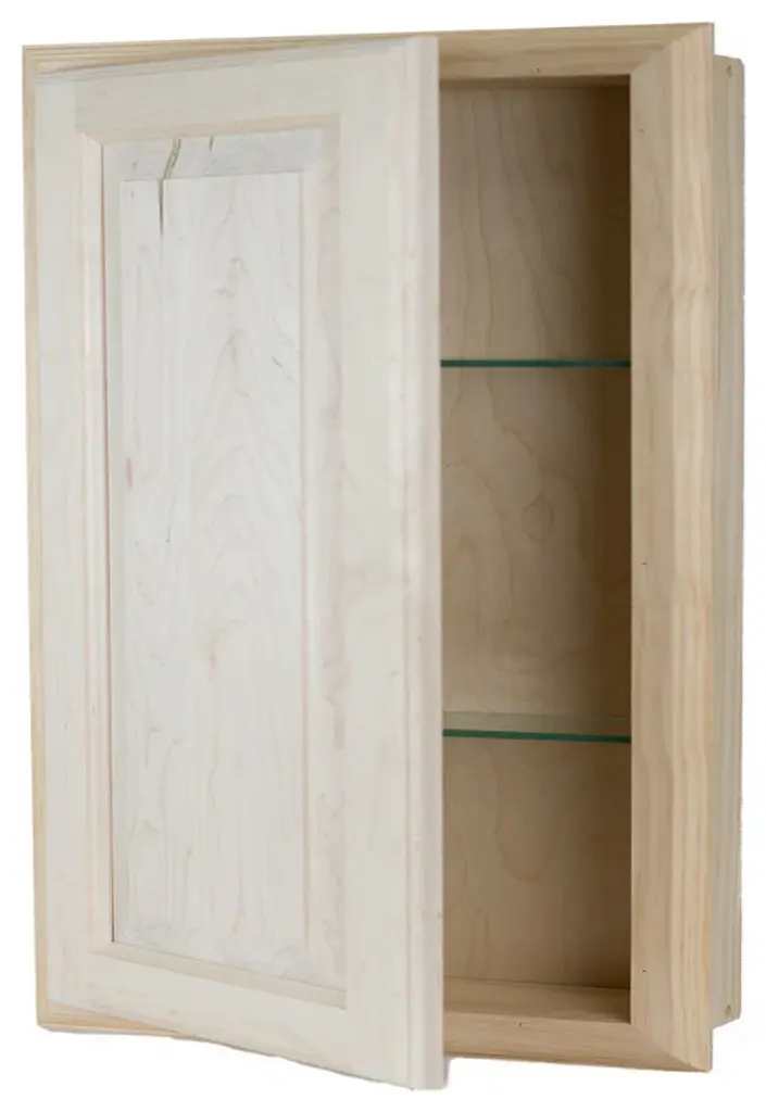 Mounts on the wall with steel mounting brackets inside for an easy installation. With two mounting methods, there is no need to worry about where the studs are in the wall. Four fully adjustable glass shelves slide into our patented shelf supports so they don''t tip or rock. Raised panel door sits on concealed hinges with soft close feature, door is reversible so you can mount it to open either direction. Perfect as a medicine cabinet, spice cabinet, or storage cabinet anywhere. OVERALL Measurements are 31.5h x 15.5w x 5.25"d OVERALL. You''ll have nearly 4.5" of depth INSIDE the cabinet. Unfinished bare wood can be painted or stained as desired. Solid pine cabinet box with solid maple door. Proudly made in Sarasota, FL.