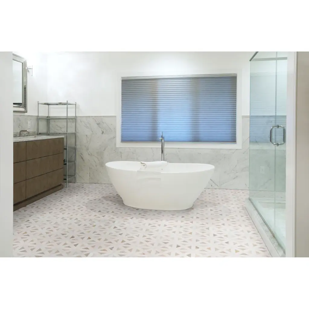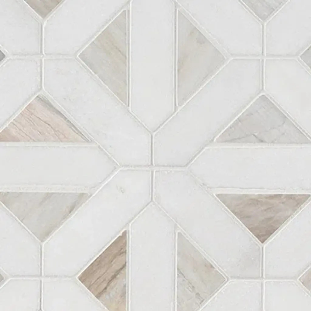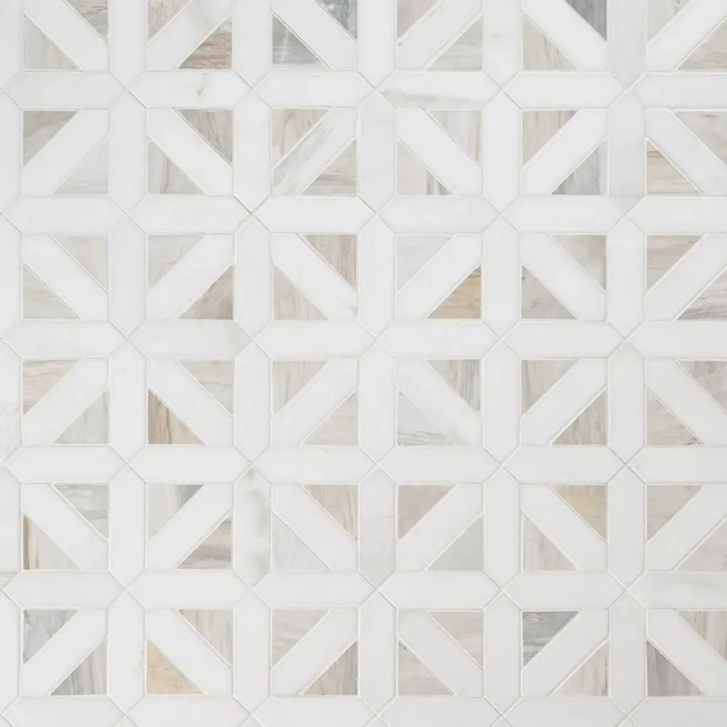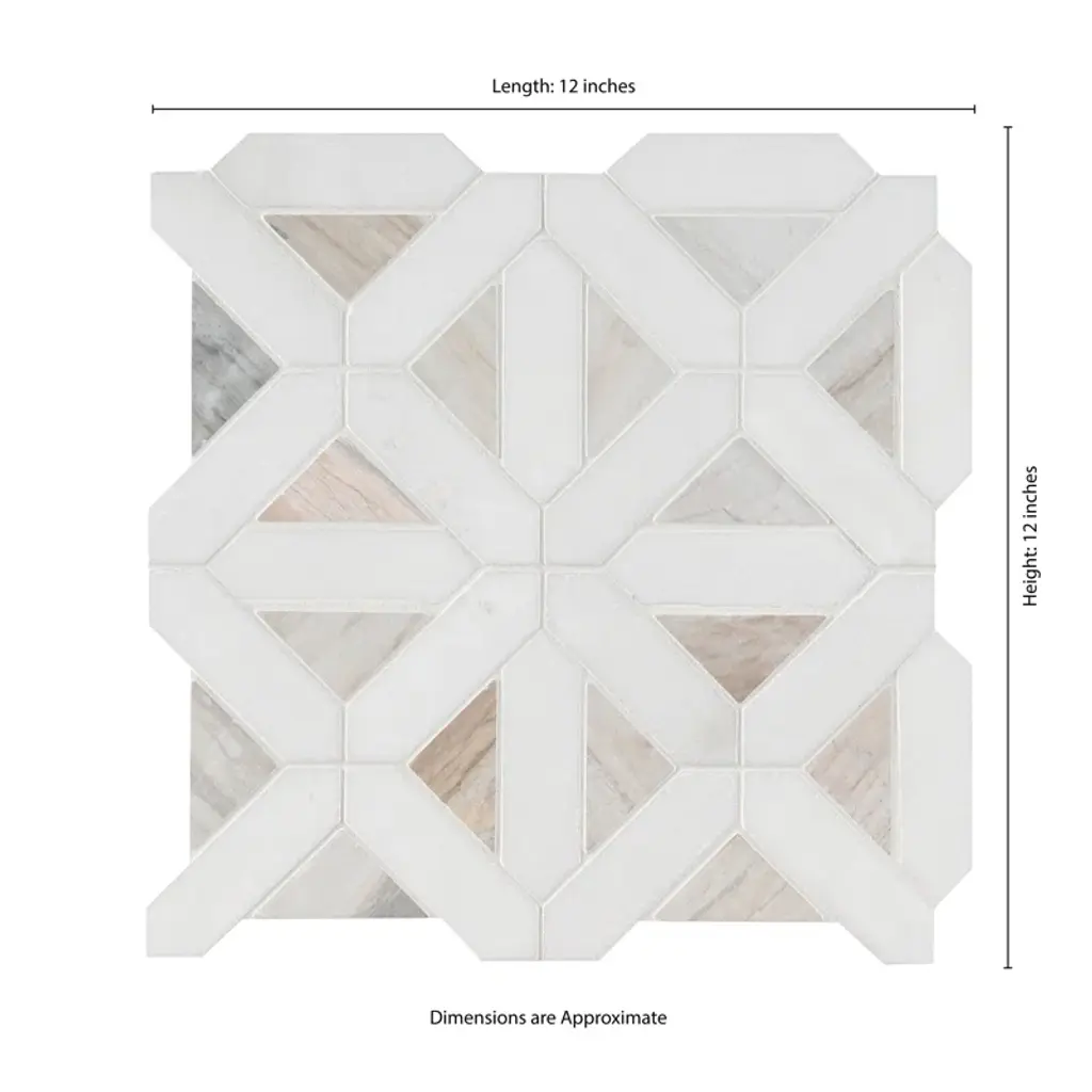 MSI's Angora Geometric Polished Marble Mosaic Tile is classic marble with a modern edge featuring distinctive, warm beiges and gold tones accented by cool gray and white tones. It’s ideal for creating beautiful kitchen backsplash, shower surrounds, accent walls, and other design features throughout homes and light-use commercial properties. The timeless shape and color of this patterned marble mosaic make it exceedingly versatile — complementing traditional to contemporary design styles. Pair it with a marble tile or mosaics for a style-savvy cohesive look, or use it alone to add a touch of unexpected detail and interest to any space. Tiles are prearranged on 12x12 mesh-backed sheets for simplified installation and coordinating moldings give your project a professional look.