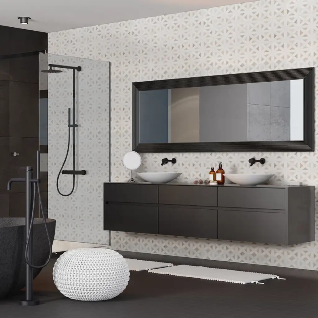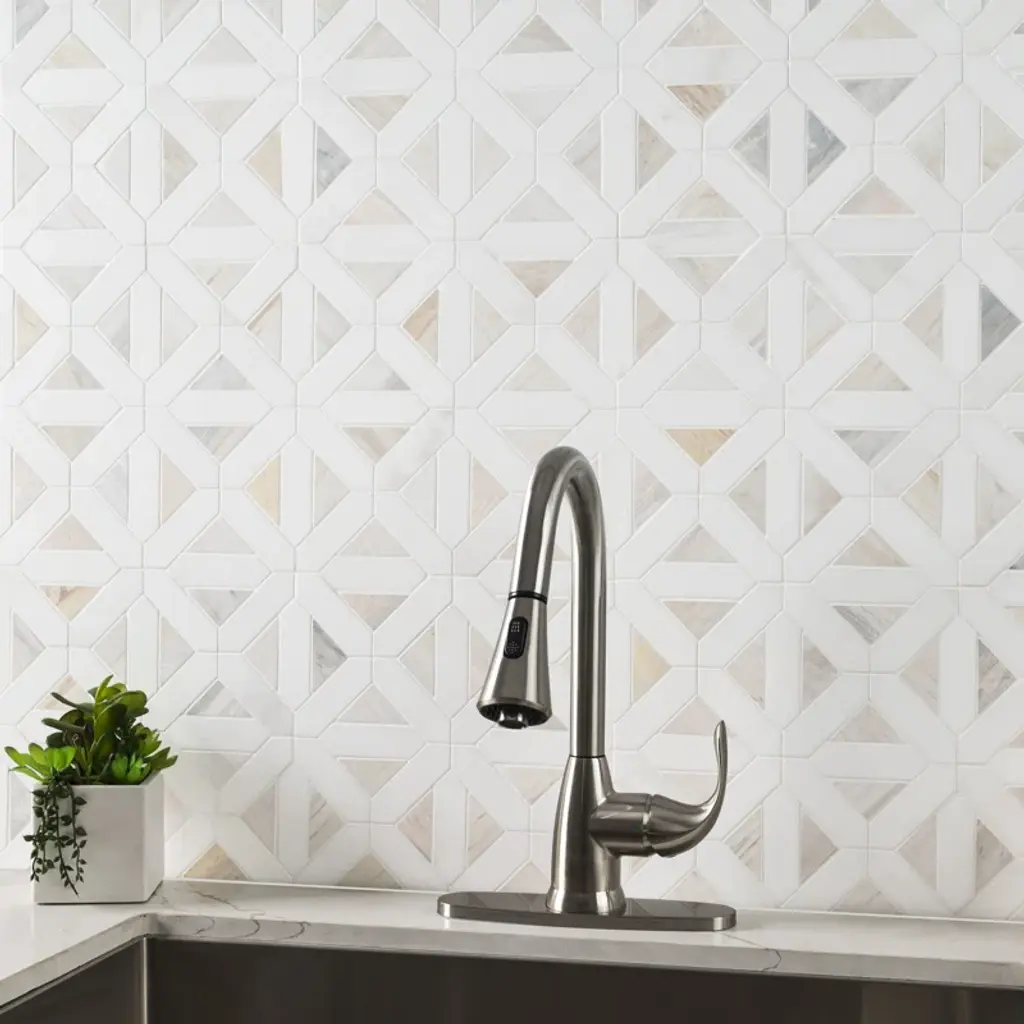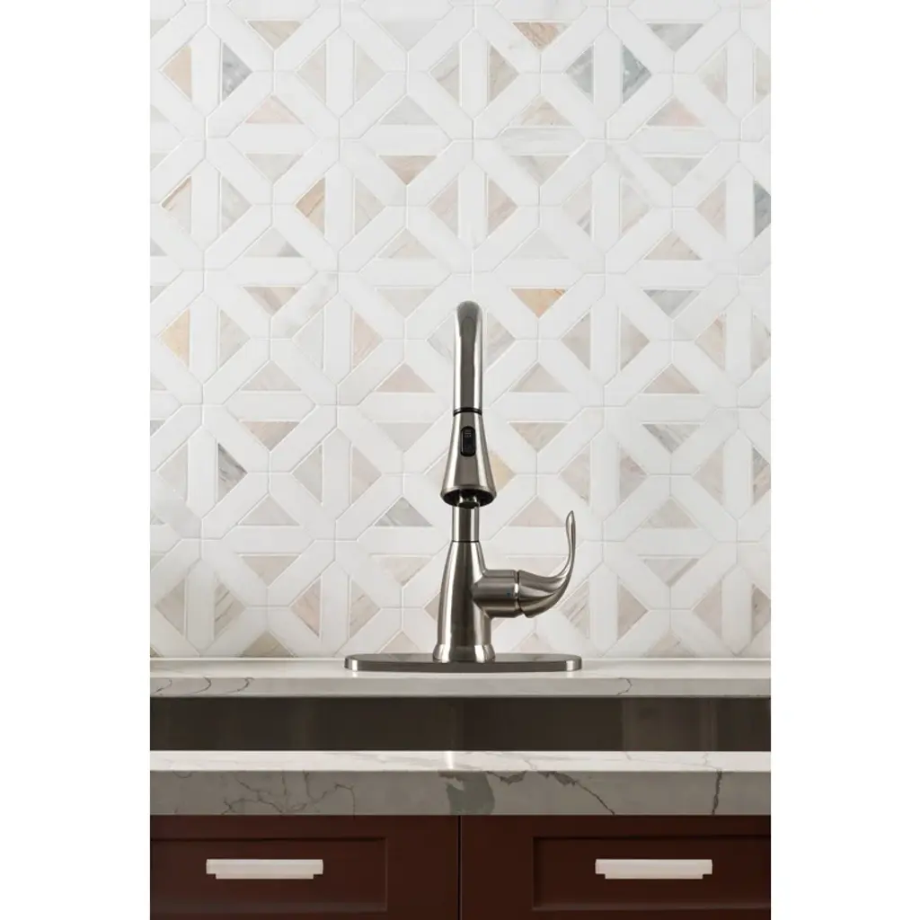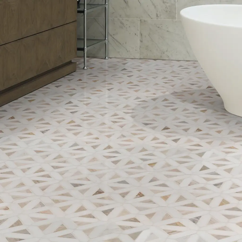 MSI's Angora Geometric Polished Marble Mosaic Tile is classic marble with a modern edge featuring distinctive, warm beiges and gold tones accented by cool gray and white tones. It’s ideal for creating beautiful kitchen backsplash, shower surrounds, accent walls, and other design features throughout homes and light-use commercial properties. The timeless shape and color of this patterned marble mosaic make it exceedingly versatile — complementing traditional to contemporary design styles. Pair it with a marble tile or mosaics for a style-savvy cohesive look, or use it alone to add a touch of unexpected detail and interest to any space. Tiles are prearranged on 12x12 mesh-backed sheets for simplified installation and coordinating moldings give your project a professional look.