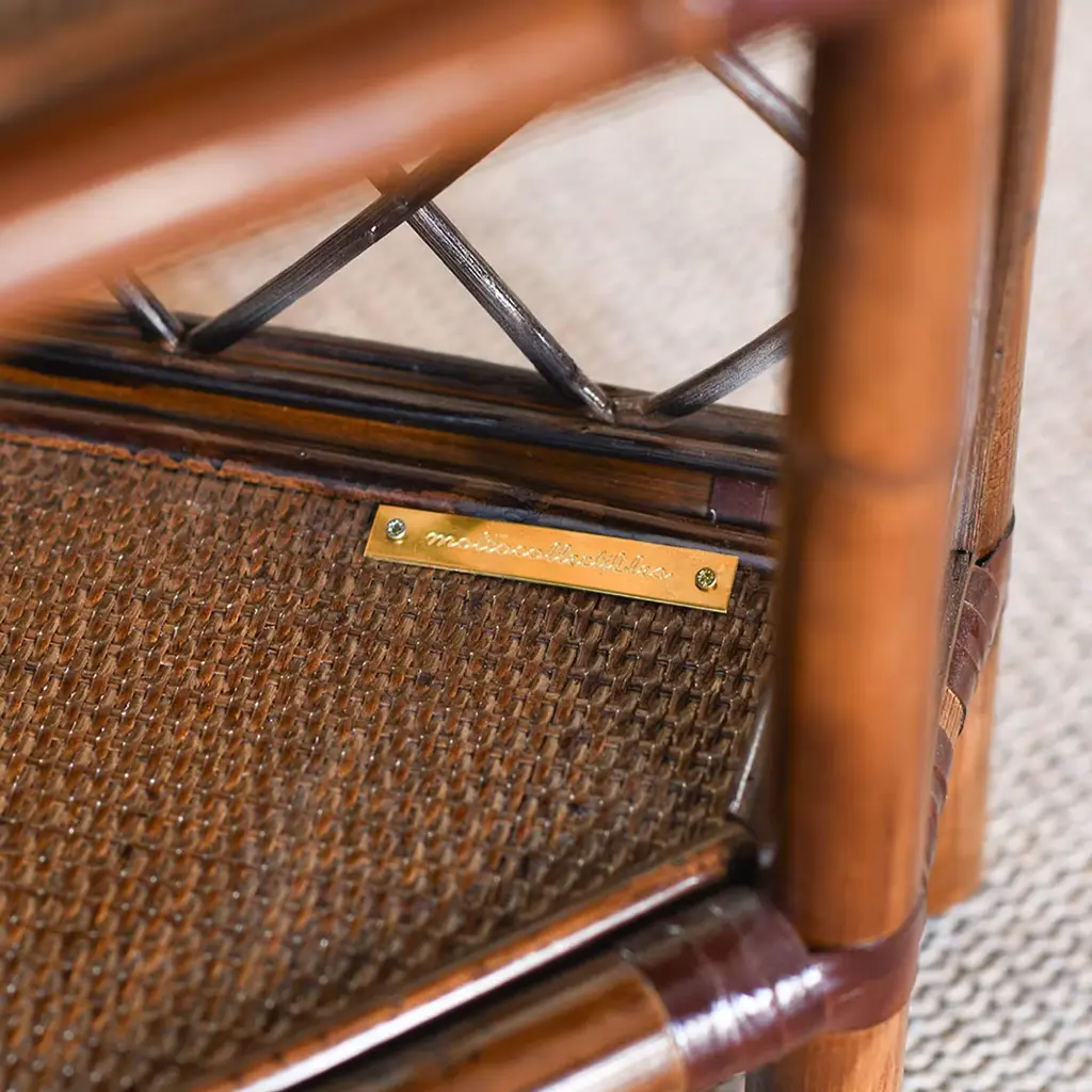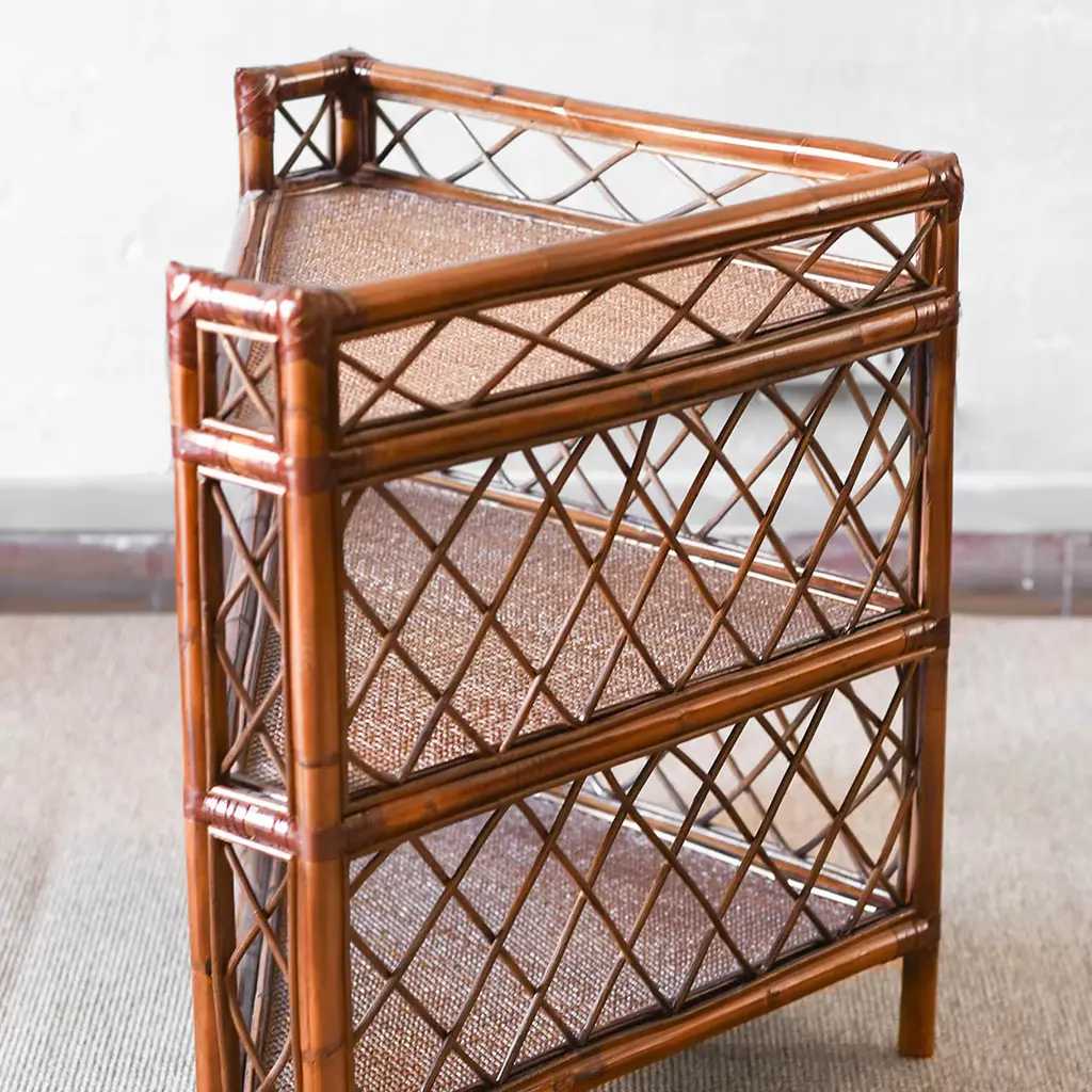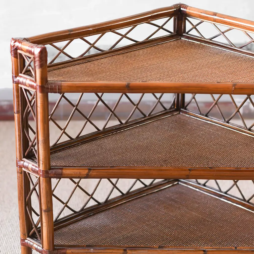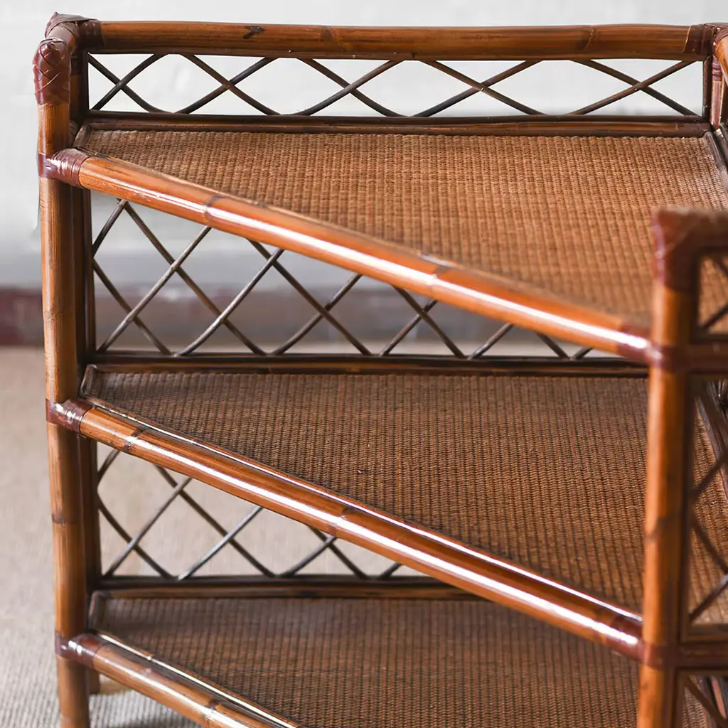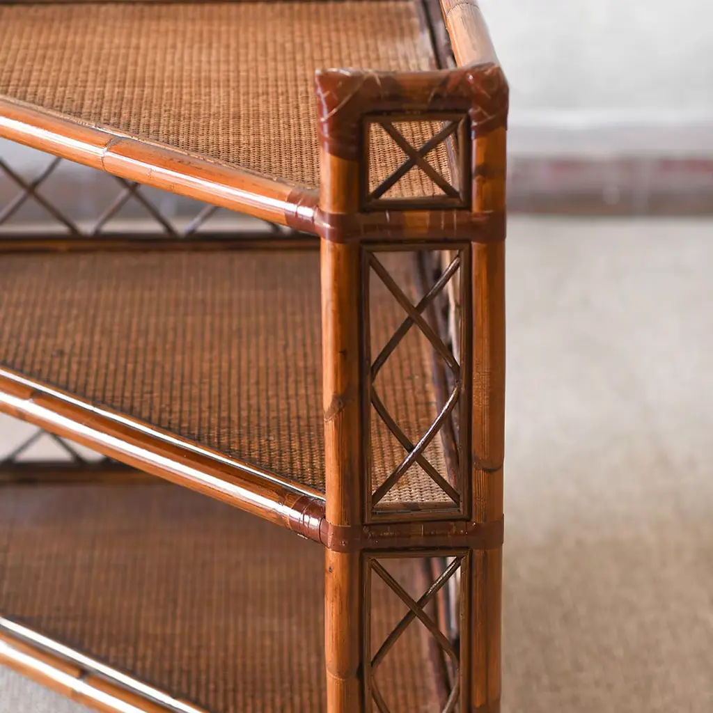 Refined addition to corners one wants to enrich with books, photoframes or a plant, this angular three-shelf etagère stands out for its airy openwork structure minutely handcrafted of wicker and bamboo canes. Held together by precious leatehr bindings, the frame flaunts a hazelnut finish of striking elegance. Master artisans take care of the whole crafting process ensuring the piece's uniqueness.