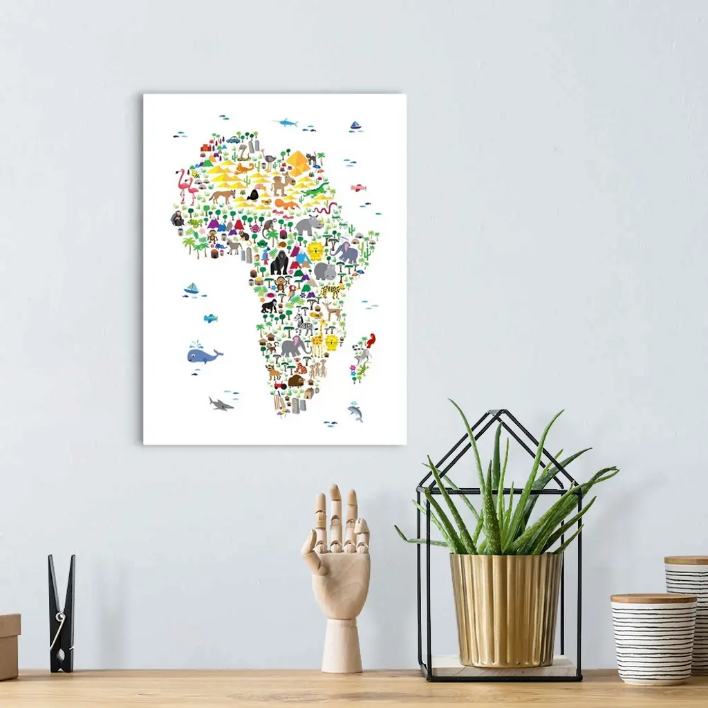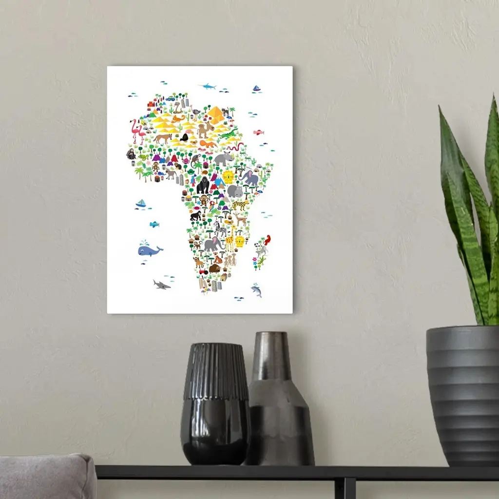 A map of the Africa featuring cartoon animals. A colorful, fun and exciting map for any young child to engage their imaginations. White Background.