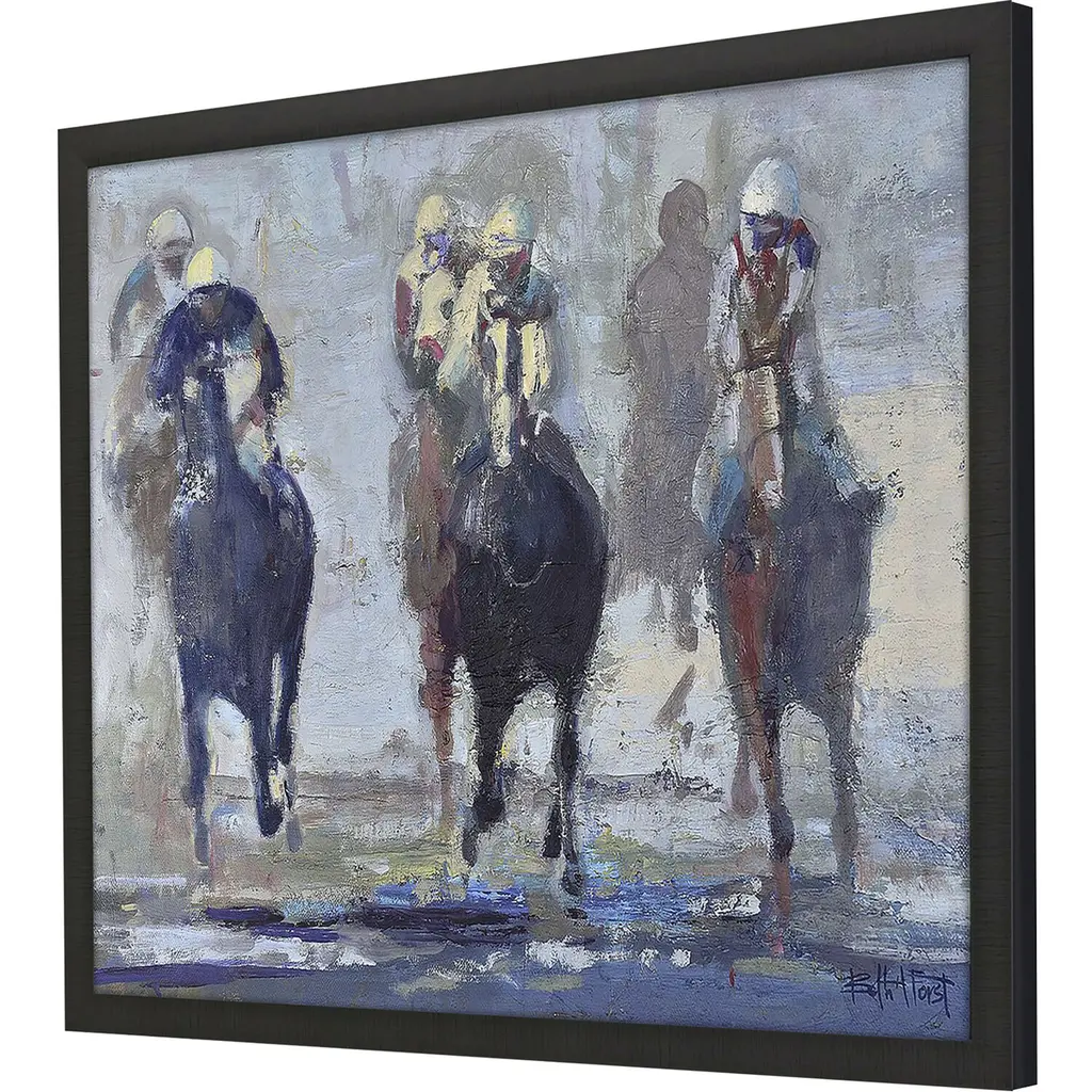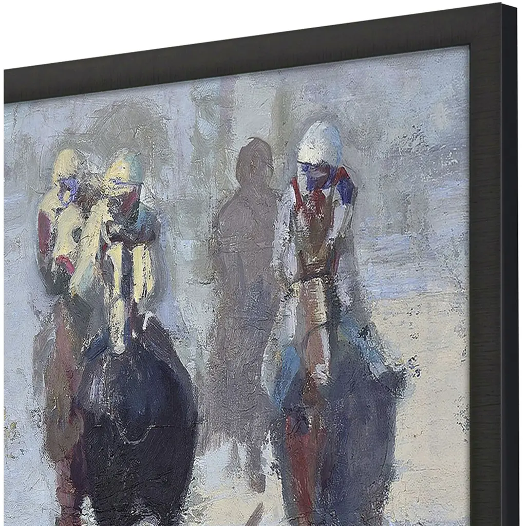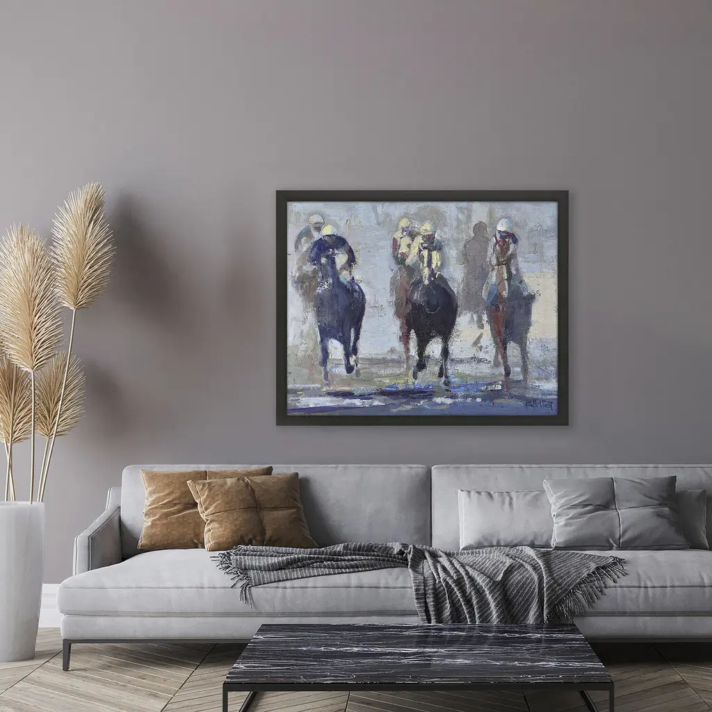 Horses races toward the finish line at the track. Framed in a black block contemporary moulding.