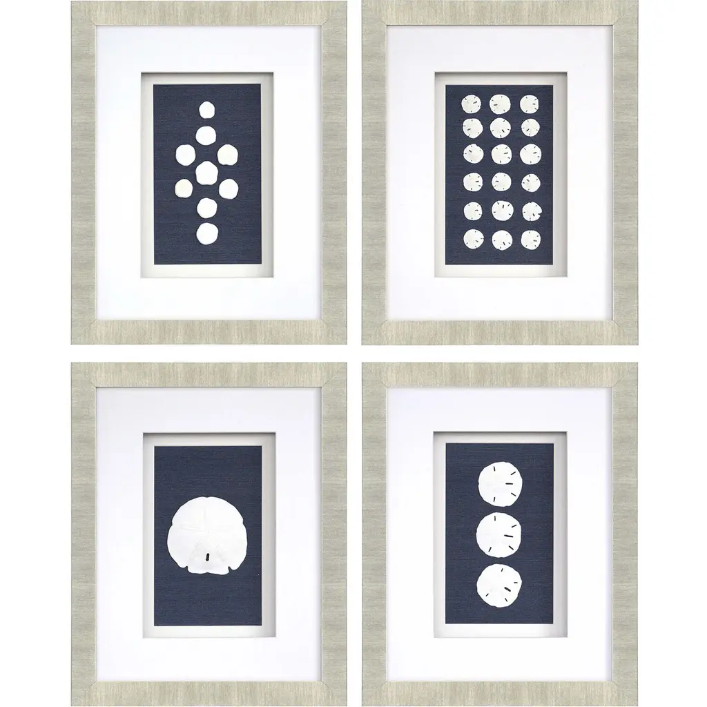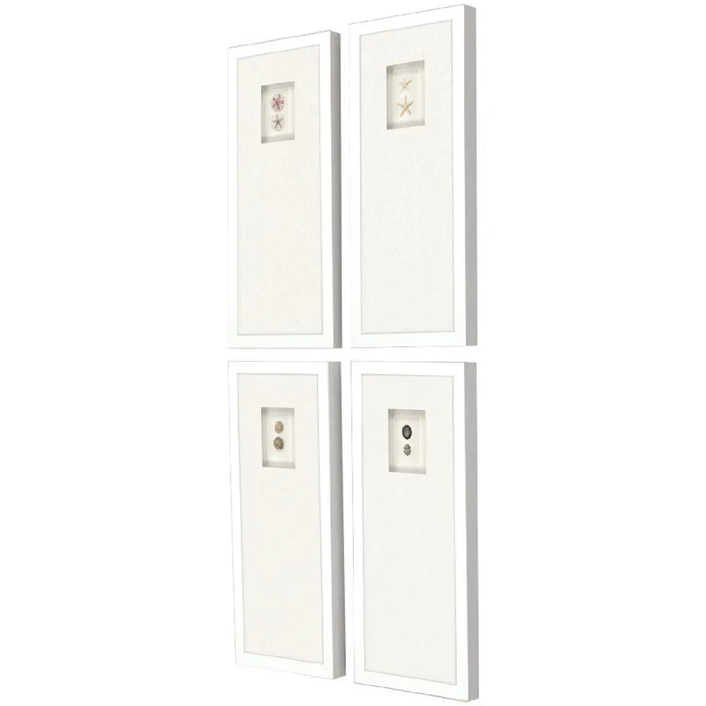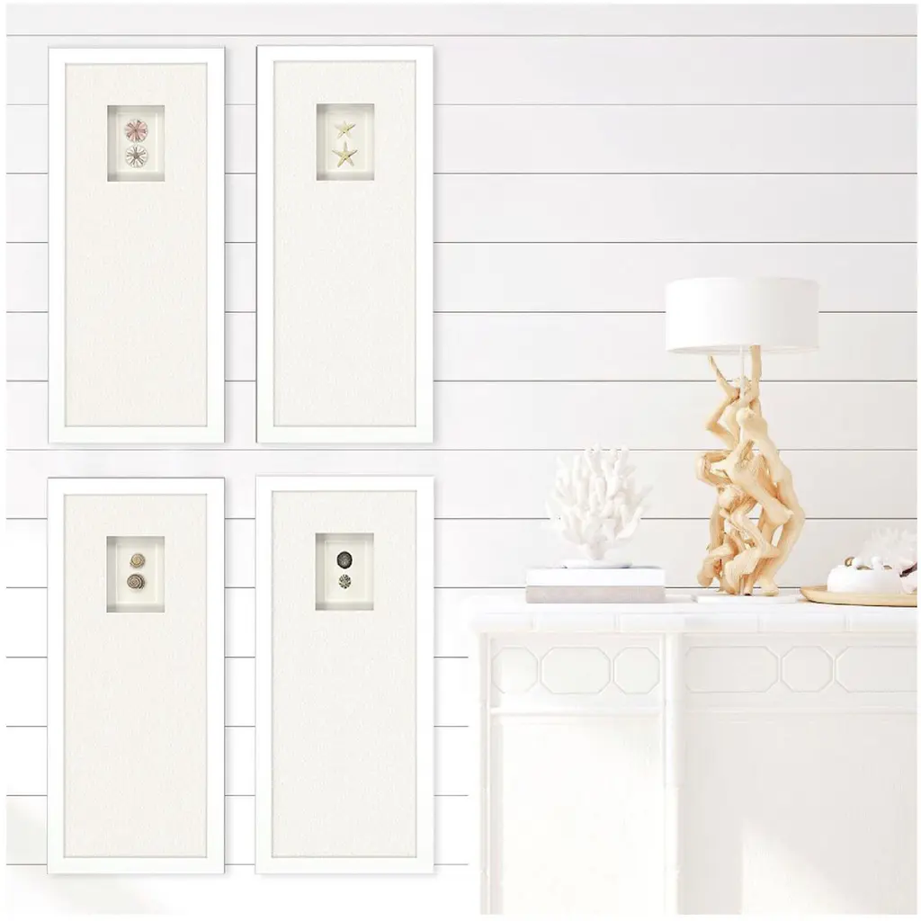 Gifts from the ocean are individually mounted by hand and feature premium raised matting. Framed in a lacquered white wood shadow box style moulding.