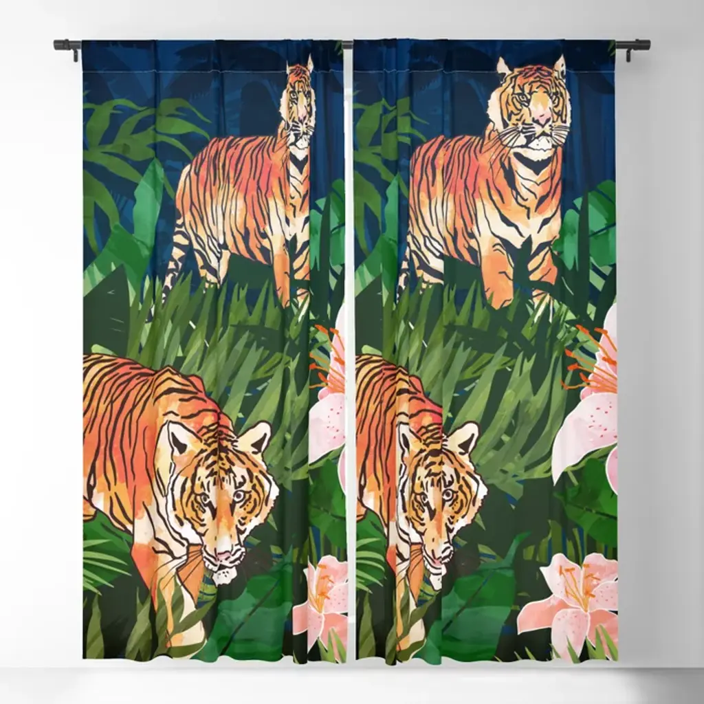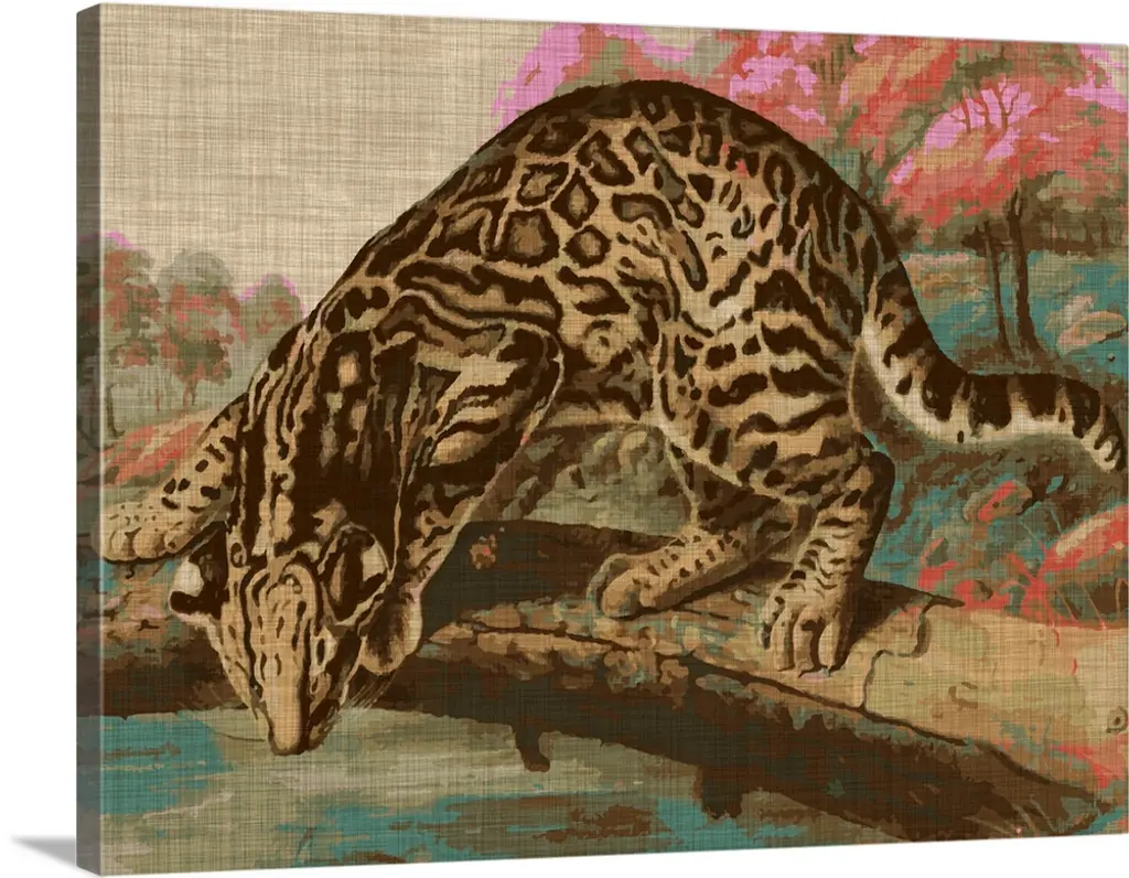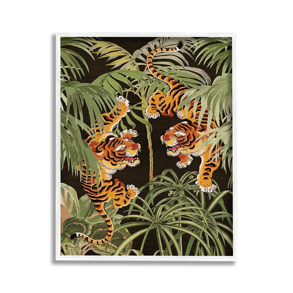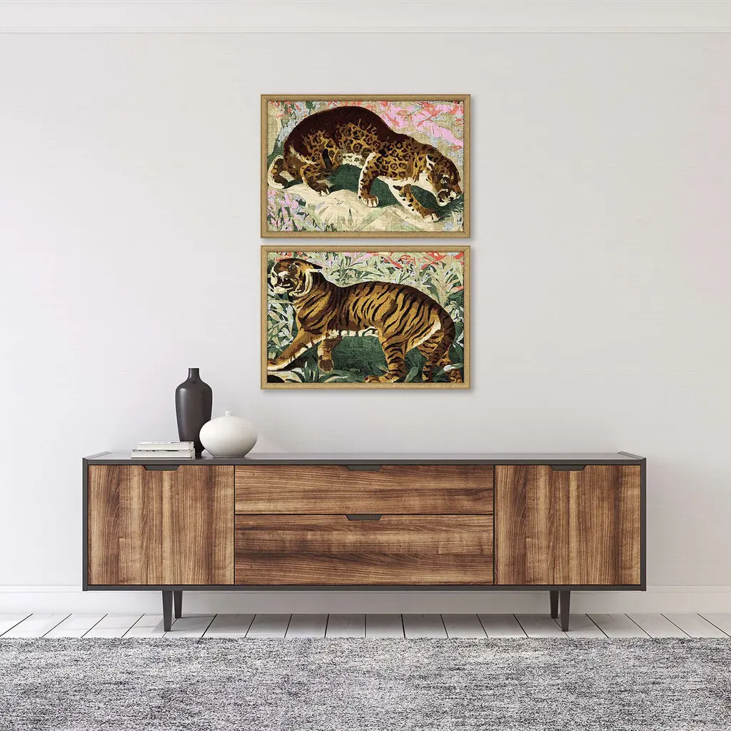 Fierce predators leap from a back drop of colorful foliage. Framed in an antique gold wood with embossed weave pattern.