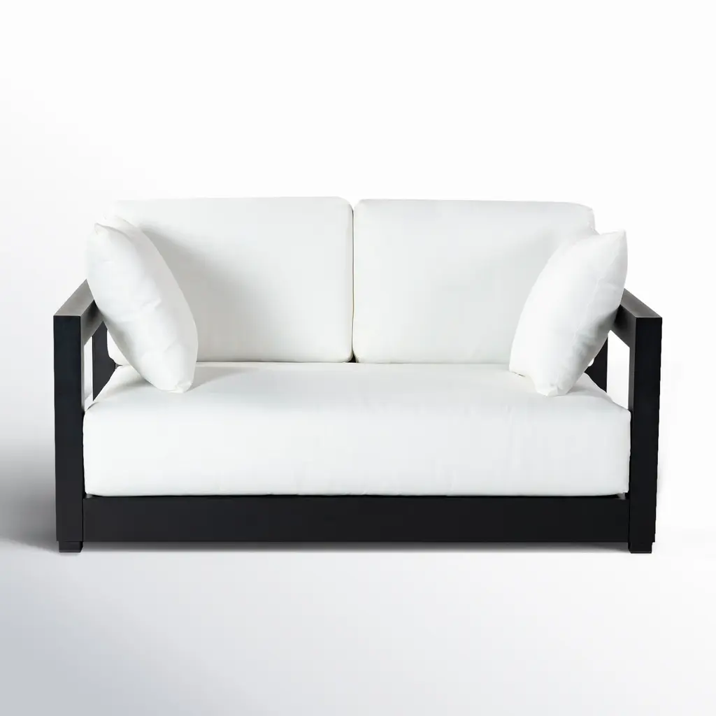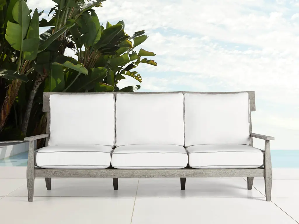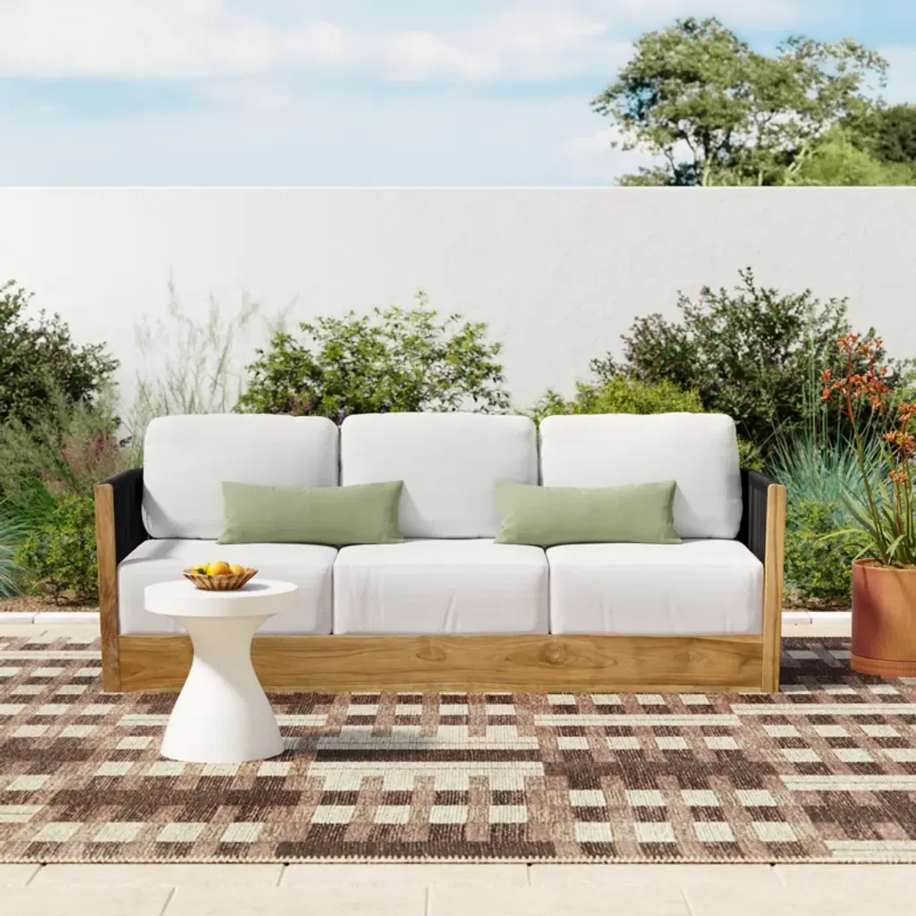 This teak and rope patio sofa is a great spot to lounge on warm, sunny days. It's crafted from FSC-certified teak hardwood with a powder-coated aluminum inner frame, and the curved sides and back are lined with nautical-grade rope for a breezy vibe. The UV- and water-resistant Sunbrella® cushions come in a muted shade, while foam padding gives you all the support you need as you relax.
