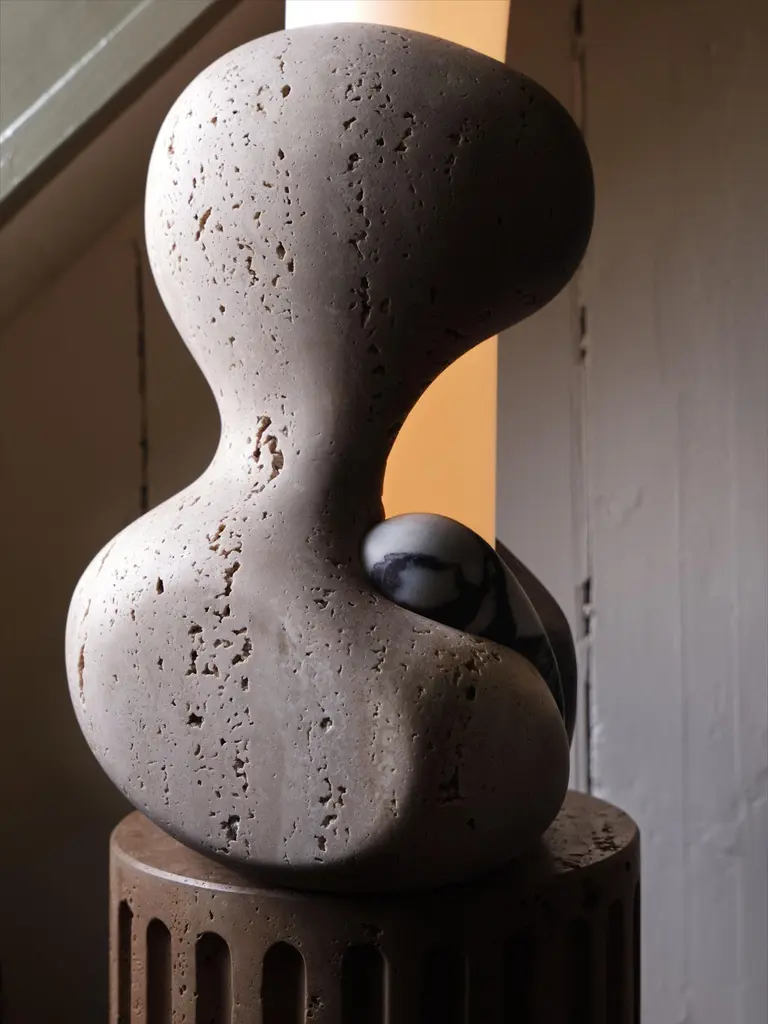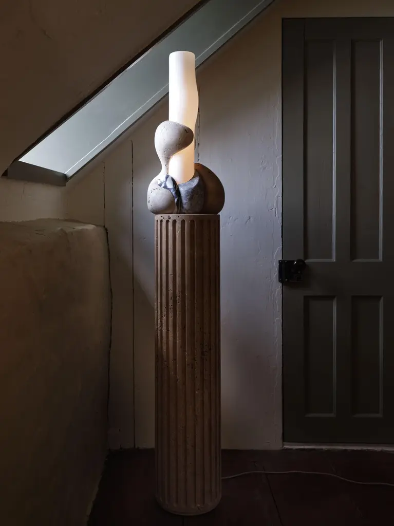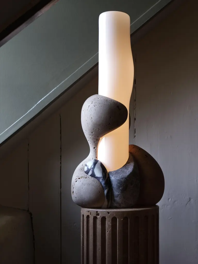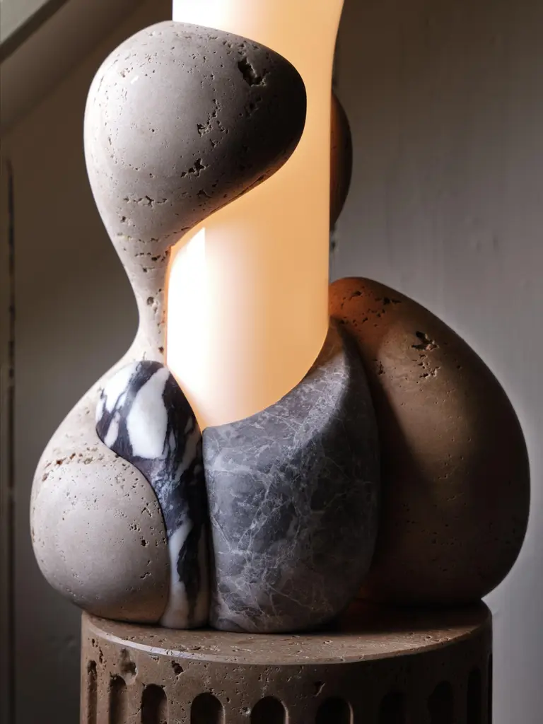 Perched atop of a round fluted travertine plinth, organic forms carved from various types of stone embrace a hand-blown glass cylinder which glows from within.Materials: Light and Dark Travertine, Siylon Gray, Viola Calacatta, White Glossy GlassDimensions: 11" W x 10-1/2" D x 66-5/8" HCustomization: Available.Lamping: 24V LED module. 15W, 1300 lumens, 2700K color temperature. 120V/240VAC compatible transformer included, housed in lamp base. Includes 84" cord - please specify plug type when ordering.