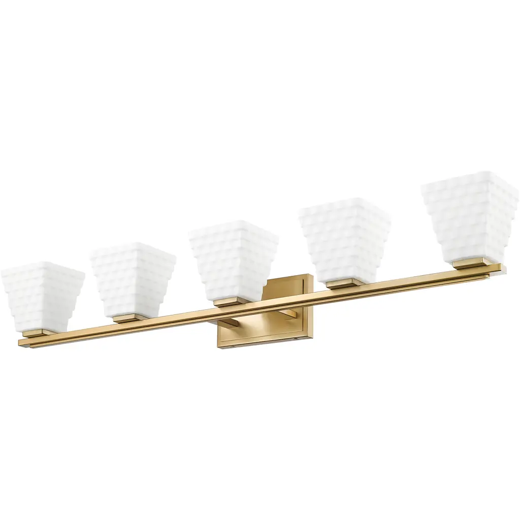 Encourage texture and depth in a contemporary bathroom setting with this modern five-light vanity bath light. Its fresh perspective is established with five stacked opal glass shades, each with a tapering square silhouette that adds bright, diffused illumination. The warmth of a modern gold frame finish is a perfect finishing touch in your en suite.