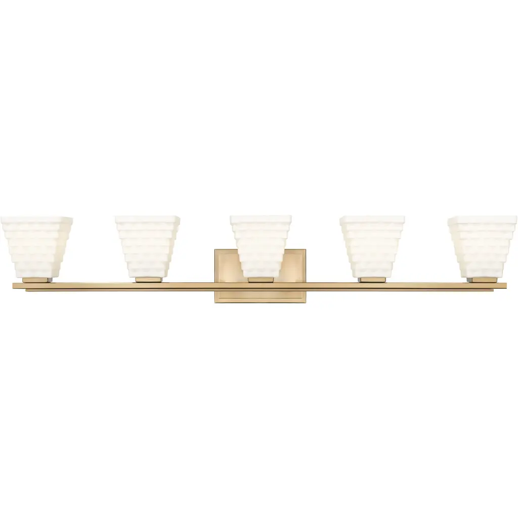 Encourage texture and depth in a contemporary bathroom setting with this modern five-light vanity bath light. Its fresh perspective is established with five stacked opal glass shades, each with a tapering square silhouette that adds bright, diffused illumination. The warmth of a modern gold frame finish is a perfect finishing touch in your en suite.