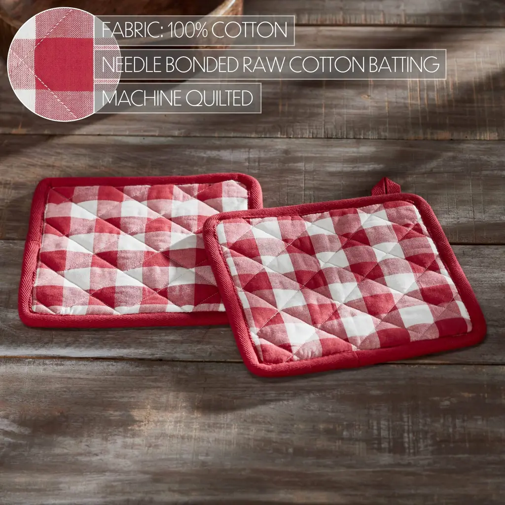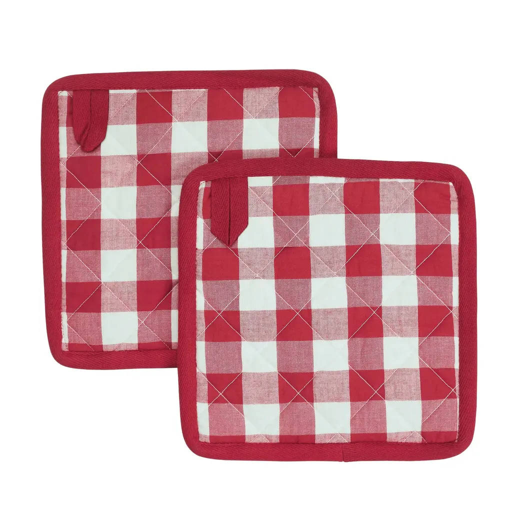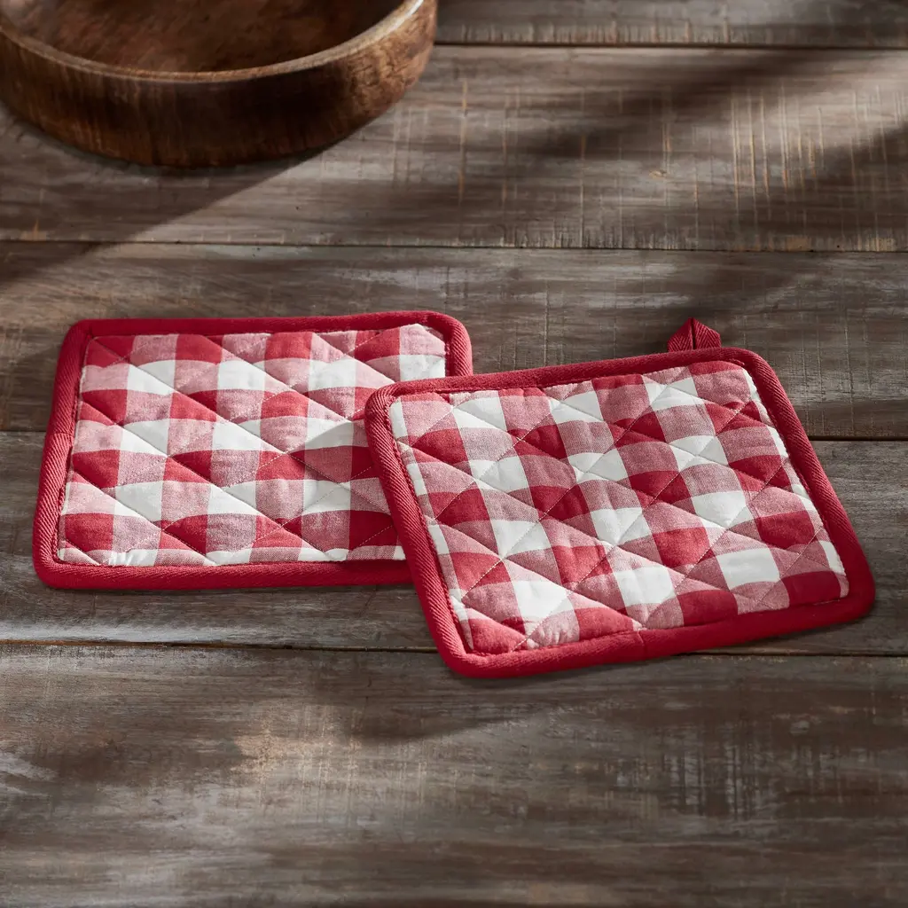 Add a touch of farmhouse charm to your country kitchen with the VHC Brands Cotton Pot Holder Set of 2 from the Annie Buffalo Check Collection. Crafted with meticulous attention to detail, this set of 2 square 8x8-inch pot holders embodies the essence of rustic charm, featuring a classic Country Black Buffalo Check pattern. These pot holders are not only stylish but also heat-resistant, providing you with the perfect combination of form and function for your cooking needs. The flat weave design and iconic Buffalo Check pattern add a touch of rustic country appeal to your kitchen, making it an ideal choice for those who appreciate the warmth and character of farmhouse-inspired accents. The set comes in a timeless Country Black color, seamlessly blending with your decor and adding a classic country touch to your culinary environment. Whether you're preparing a home-cooked meal or simply adding accents to your kitchen, the VHC Brands Cotton Pot Holder Set of 2 is a welcoming addition that beautifully reflects the cozy and inviting atmosphere of farmhouse and country-style living.