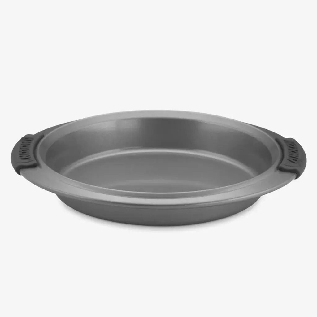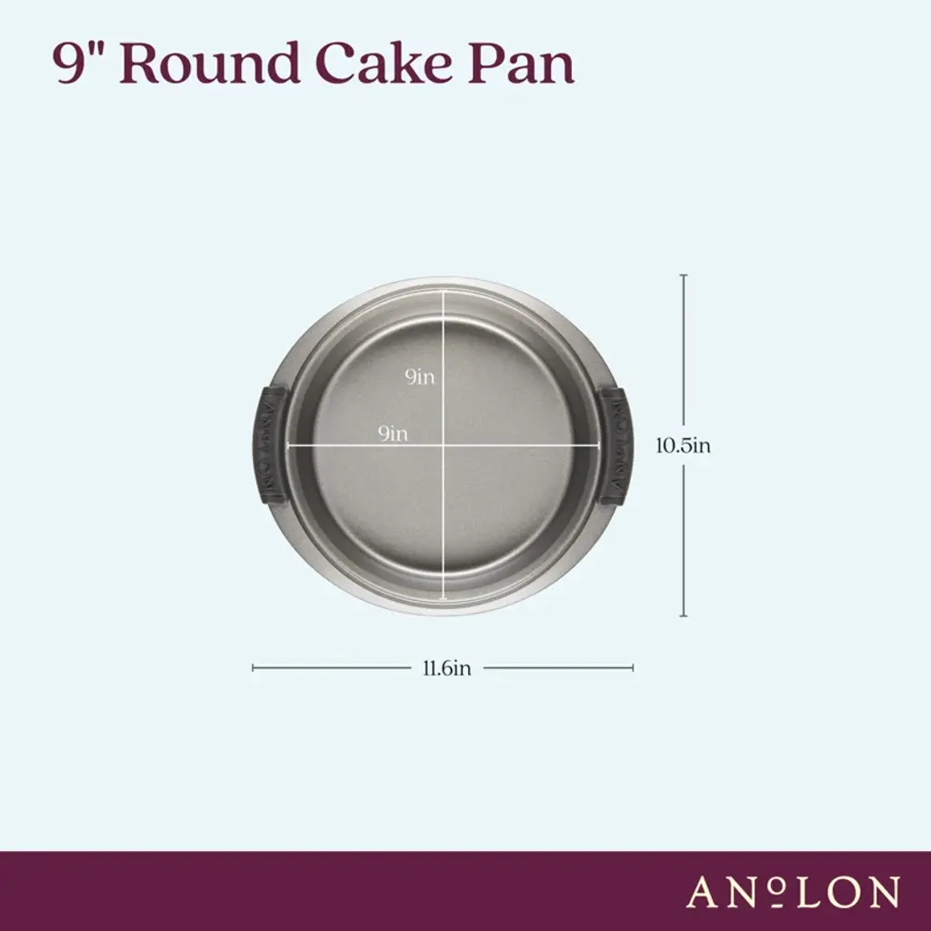 Bake up the perfect birthday. Classic round cake pan features superior nonstick for even, easy-release of traditional round cake layers. Works in a pinch for casseroles and small roasts, too, with a wide rim and silicone grips for comfort and control, even with bulky oven mitts on. Oven safe to 450°f, this nonstick pan is crafted from heavy gauge steel to resist warping and features a beautiful bronze color tone to promote even browning and provide the even heat distribution necessary for successful baking and roasting.