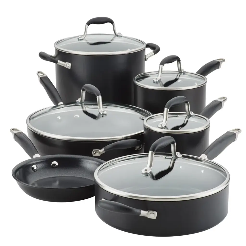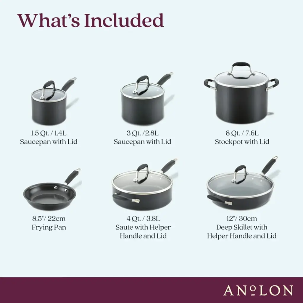 Sublime cooking starts here. Anolon Advanced Home provides aspiring chefs with one of the very best nonsticks on the market. Step up to a crafted collection of kitchen essentials designed to outperform, outlast, and outshine your current cookware. Engineered for fast, uniform heating, these hard-anodized pots and pans are twice as hard as stainless steel for durability that lasts. Oven safe to 400 degrees F with tempered glass lids to watch recipes as they cook, the frying pans and cooking pots in this kitchen set feature Infinity Slide technology for one of the longest lasting and smoothest-gliding cookware surfaces you can buy. If you expect more from your nonstick, welcome to the sublime cooking experience of Anolon Advanced Home.